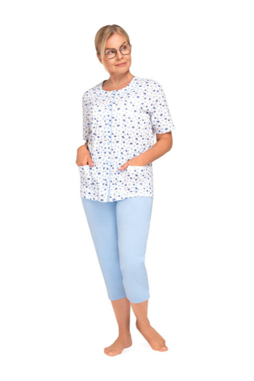 Dámske pyžamo Maria 200 je dokonalou kombináciou pohodlia a elegancie. Je vyrobené zo 100 % mäkkej a vzdušnej bavlny a poskytuje celonočné pohodlie. Vzorované tričko s krátkymi rukávmi a okrúhlym výstrihom má klasický šarm a zapínanie na gombíky, zatiaľ čo hladké nohavice s 3/4 dĺžkou zaručujú voľnosť pohybu a pohodlné nosenie. Ideálna voľba na všetky ročné obdobia! 100 % bavlna.