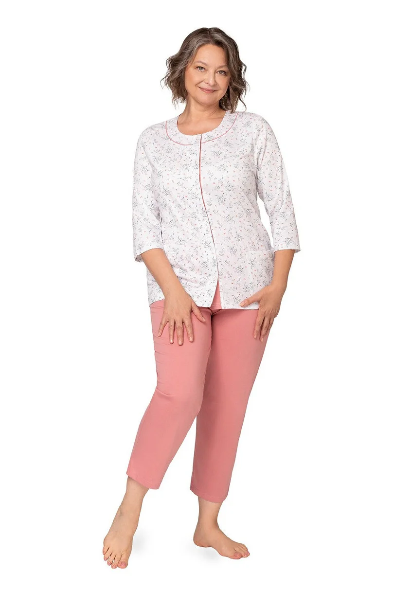 Dámske pyžamo Maria II 201 je dokonalou kombináciou pohodlia a elegancie. Je vyrobené zo 100 % prírodnej bavlny, je mäkké, priedušné a príjemné na nosenie. Košeľu zdobí jemný kvetinový vzor, má polkruhový výstrih a 3/4 rukávy, čo zaručuje štýlový a ženský vzhľad. Praktické zapínanie na gombíky uľahčuje obliekanie a je pohodlné pre dojčiace matky. Súčasťou súpravy sú hladké nohavice v 3/4 dĺžke, ktoré zaručujú voľnosť pohybu a pohodlie v každej polohe. Ideálna voľba na každé ročné obdobie!