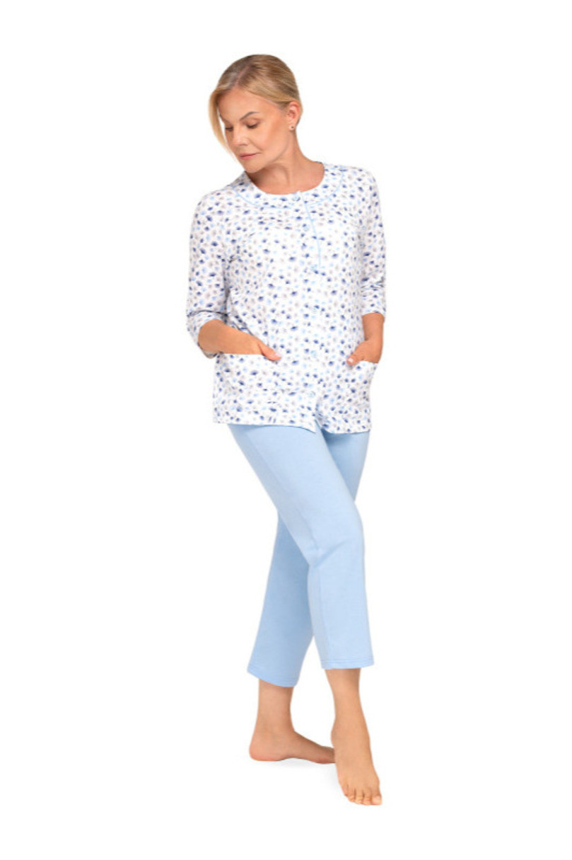 Dámske pyžamo Maria II 201 je dokonalou kombináciou pohodlia a elegancie. Je vyrobené zo 100 % prírodnej bavlny, je mäkké, priedušné a príjemné na nosenie. Košeľu zdobí jemný kvetinový vzor, má polkruhový výstrih a 3/4 rukávy, čo zaručuje štýlový a ženský vzhľad. Praktické zapínanie na gombíky uľahčuje obliekanie a je pohodlné pre dojčiace matky. Súčasťou súpravy sú hladké nohavice v 3/4 dĺžke, ktoré zaručujú voľnosť pohybu a pohodlie v každej polohe. Ideálna voľba na každé ročné obdobie!
