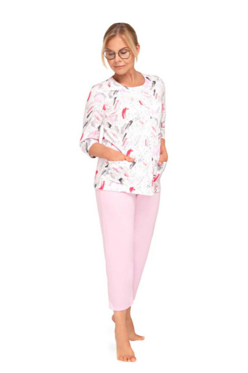 Dámske pyžamo Maria II 201 je dokonalou kombináciou pohodlia a elegancie. Je vyrobené zo 100 % prírodnej bavlny, je mäkké, priedušné a príjemné na nosenie. Košeľu zdobí jemný kvetinový vzor, má polkruhový výstrih a 3/4 rukávy, čo zaručuje štýlový a ženský vzhľad. Praktické zapínanie na gombíky uľahčuje obliekanie a je pohodlné pre dojčiace matky. Súčasťou súpravy sú hladké nohavice v 3/4 dĺžke, ktoré zaručujú voľnosť pohybu a pohodlie v každej polohe. Ideálna voľba na každé ročné obdobie!