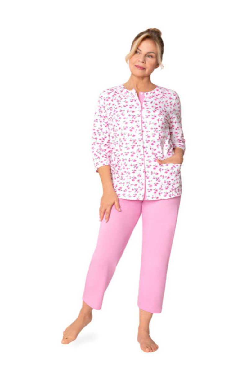 Dámske pyžamo Maria II 201 je dokonalou kombináciou pohodlia a elegancie. Je vyrobené zo 100 % prírodnej bavlny, je mäkké, priedušné a príjemné na nosenie. Košeľu zdobí jemný kvetinový vzor, má polkruhový výstrih a 3/4 rukávy, čo zaručuje štýlový a ženský vzhľad. Praktické zapínanie na gombíky uľahčuje obliekanie a je pohodlné pre dojčiace matky. Súčasťou súpravy sú hladké nohavice v 3/4 dĺžke, ktoré zaručujú voľnosť pohybu a pohodlie v každej polohe. Ideálna voľba na každé ročné obdobie!