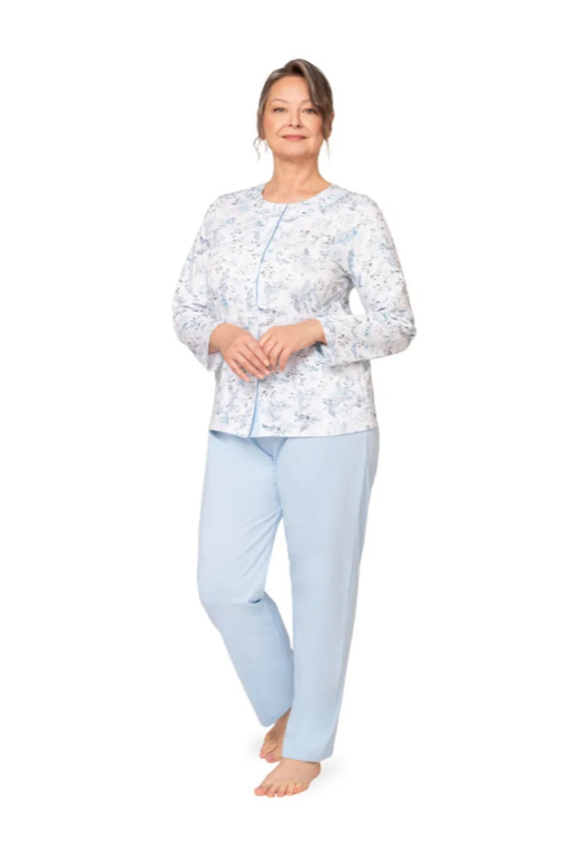Dámske pyžamo Maria 202 je dokonalou kombináciou pohodlia a elegancie na každú sezónu. Je vyrobené z kvalitnej 100 % bavlny, je mäkké, priedušné a šetrné k pokožke. Vzorované tričko s dlhými rukávmi a okrúhlym výstrihom poskytuje štýlový vzhľad, zatiaľ čo zapínanie na celé gombíky uľahčuje obliekanie. Jednotné dlhé nohavice s pohodlným elastickým pásom zaručujú voľnosť pohybu a perfektne sedia. Je to ideálna voľba pre ženy, ktoré si cenia pohodlie a klasický štýl! Materiál: 100 % bavlna.