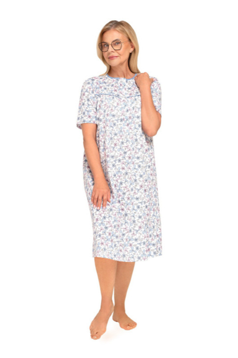 Dámske tričko s krátkymi rukávmi z mäkkej vzorovanej bavlny s digitálnou potlačou, otvoreným výstrihom, nariaseným hrudníkom, dĺžkou po kolená. materiál: 100% bavlna