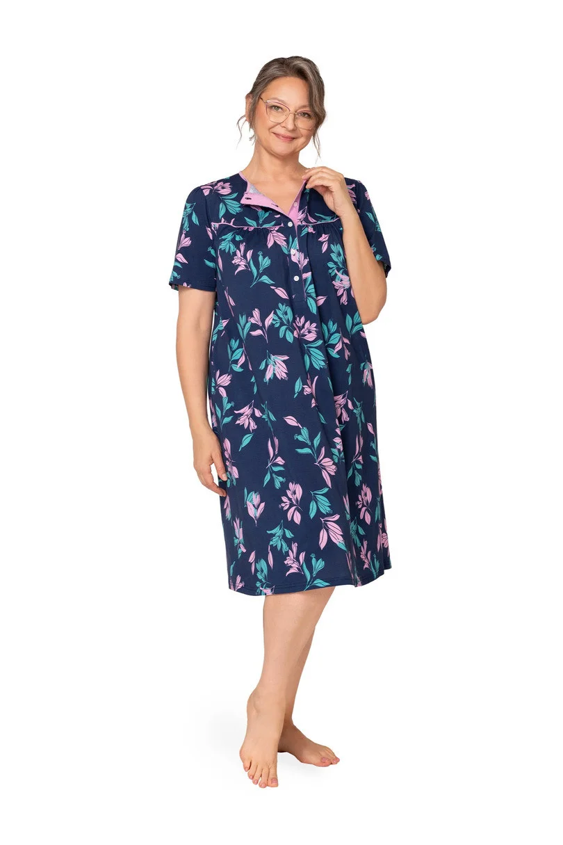 Dámske tričko s krátkymi rukávmi z mäkkej vzorovanej bavlny s digitálnou potlačou, otvoreným výstrihom, nariasenou hruďou a dĺžkou po kolená. materiál: 100% bavlna