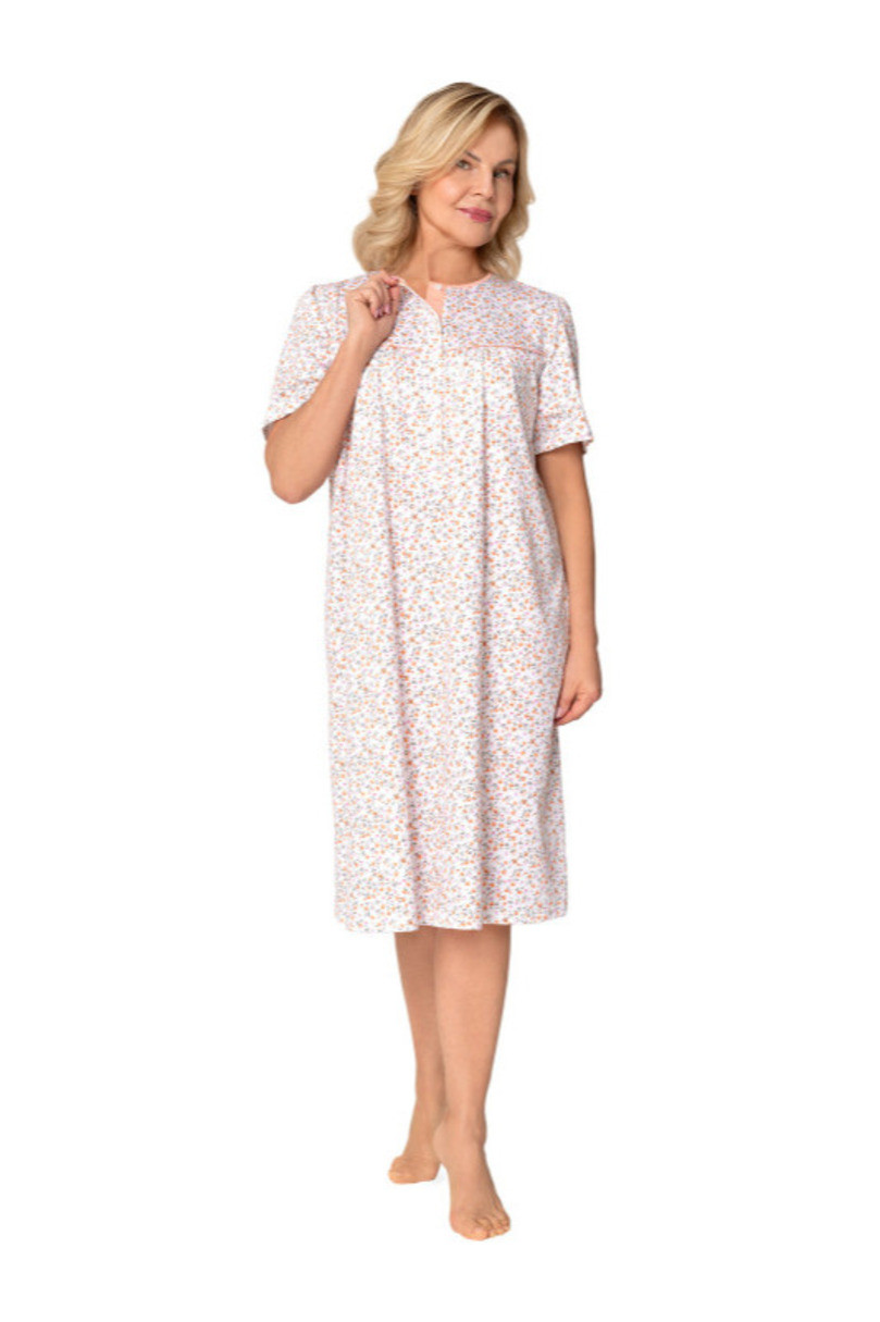 Dámske tričko s krátkymi rukávmi z jemnej vzorovanej bavlny s digitálnou potlačou. Otvorený výstrih, riasenie na prsiach, dĺžka trička po kolená. zloženie: 100 % bavlna