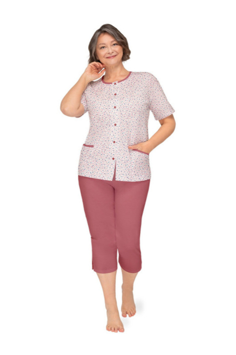 Dámske pyžamo KASIA I 265 - ľahké, bez zipsu a ideálne na leto Pyžamo KASIA I 265 je pohodlná a praktická súprava na teplejšie dni. Je vyrobené zo 100 % prírodnej bavlny a poskytuje vynikajúcu priedušnosť a pohodlie. Blúzka s krátkymi rukávmi má okrúhly výstrih, dve funkčné vrecká a zapínanie na celé gombíky, vďaka čomu je skvelou voľbou pre dojčiace matky. Krátke šortky s elastickým pásom sa dokonale prispôsobia siluete. Výrobok pochádza od poľského výrobcu, čo zaručuje vysokú kvalitu spracovania.