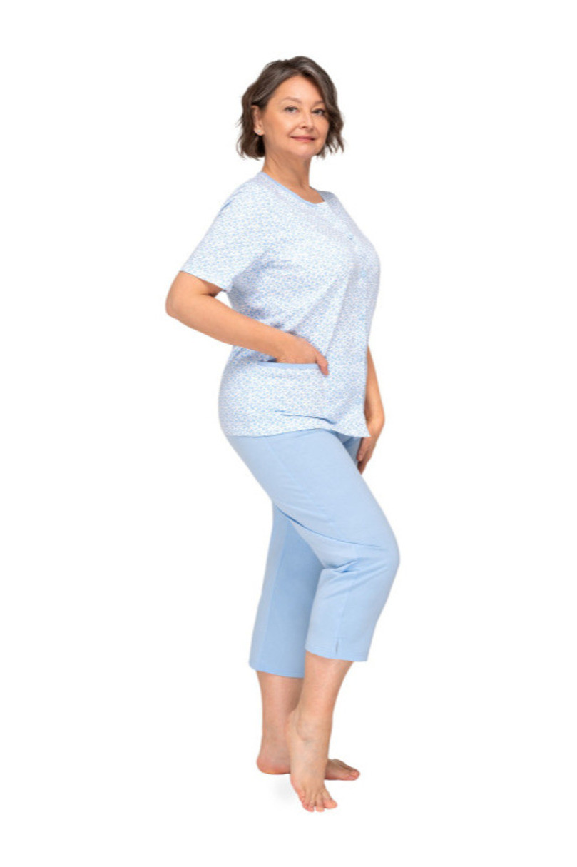 Dámske pyžamo KASIA I 265 - ľahké, bez zipsu a ideálne na leto Pyžamo KASIA I 265 je pohodlná a praktická súprava na teplejšie dni. Je vyrobené zo 100 % prírodnej bavlny a poskytuje vynikajúcu priedušnosť a pohodlie. Blúzka s krátkymi rukávmi má okrúhly výstrih, dve funkčné vrecká a zapínanie na celé gombíky, vďaka čomu je skvelou voľbou pre dojčiace matky. Krátke šortky s elastickým pásom sa dokonale prispôsobia siluete. Výrobok pochádza od poľského výrobcu, čo zaručuje vysokú kvalitu spracovania.