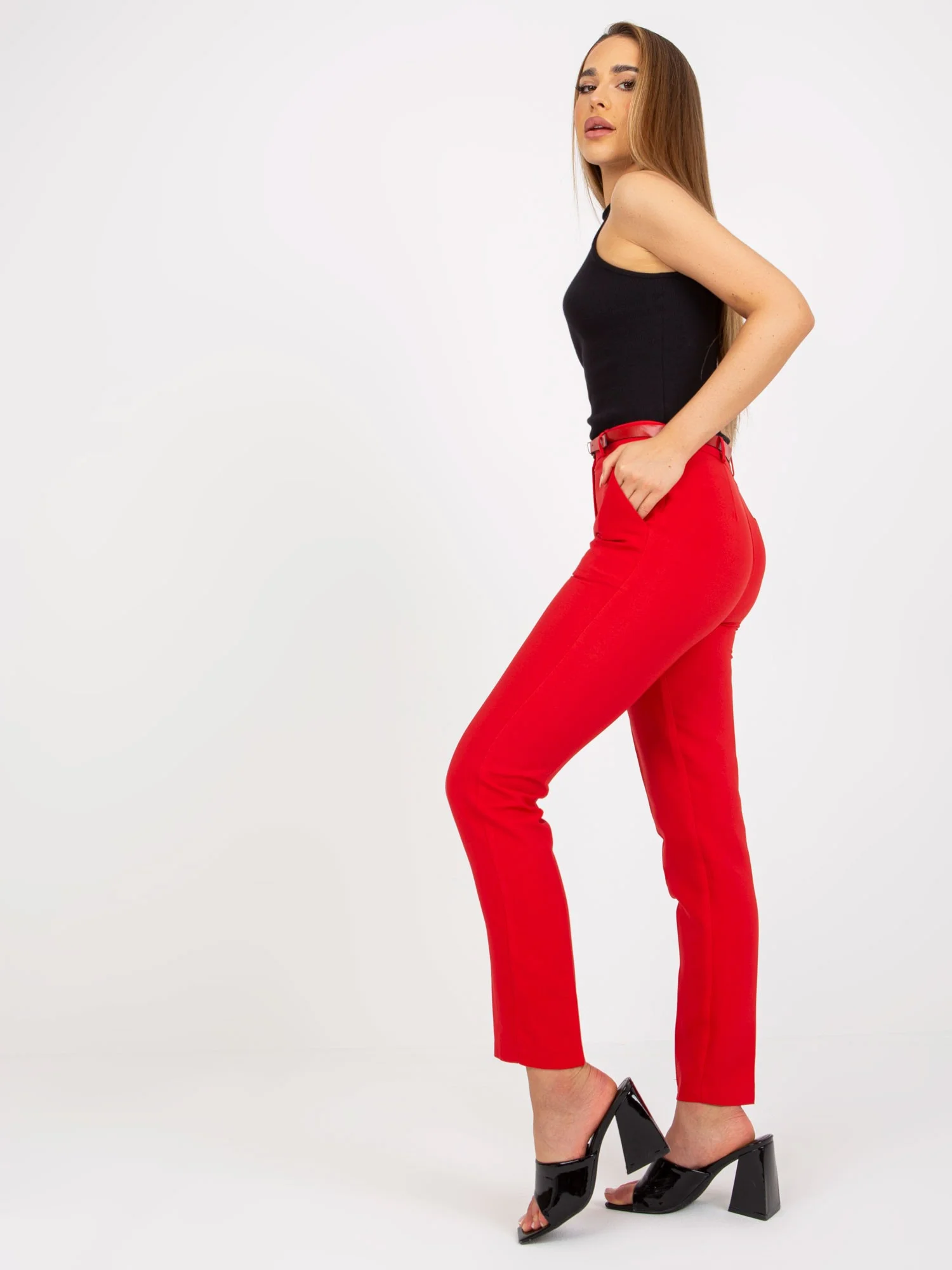 Červené látkové nohavice s opaskom. doplnky: opasok, bočné vrecká, všité zadné vrecko Zloženie materiálu: 65% polyester, 35% viskóza. spôsob prania: pranie v práčke pri 30 °C Kód produktu: BR-SP-102.57 dominantný vzor: hladký štýl: elegantný príležitosť: ležérny, biznis, mestský, formálne stretnutie Modelka má na sebe veľkosť 36. Rozmery modelu: výška 167 cm, hrudník 82 cm, pás 59 cm, boky 83 cm. Rozmery nohavíc vo veľkosti 36 merané na plocho: šírka v páse - 36 cm, výška v páse - 26 cm, celková dĺžka - 93 cm.Medzinárodná veľkosťVýškaObvod pásaObvod bokovVonkajšia dĺžka nohyVnútorná dĺžka nohy34XS156-16466-7486847336S160-16872-8090877438M162-17278-8694907540L164-17484-90102947642XL166-17888-961069877442XL168-18092-10011010278