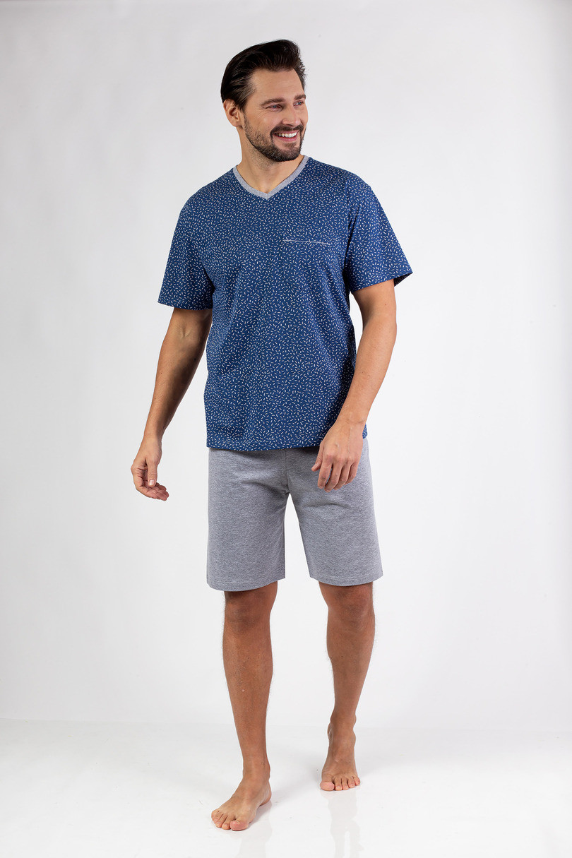 Klasické pánske pyžamo s krátkymi rukávmi z kvalitnej bavlny, so vzorovaným tričkom s výstrihom a jednofarebnými nohavicami s krátkymi nohavicami. 100 % bavlna .