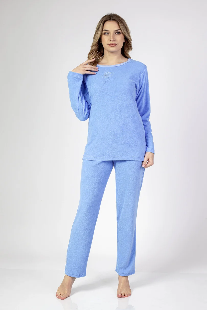 Dámske froté pyžamo s dlhým rukávom, okrúhlym výstrihom a rovnými nohavicami.Materiál: 100% bavlna .