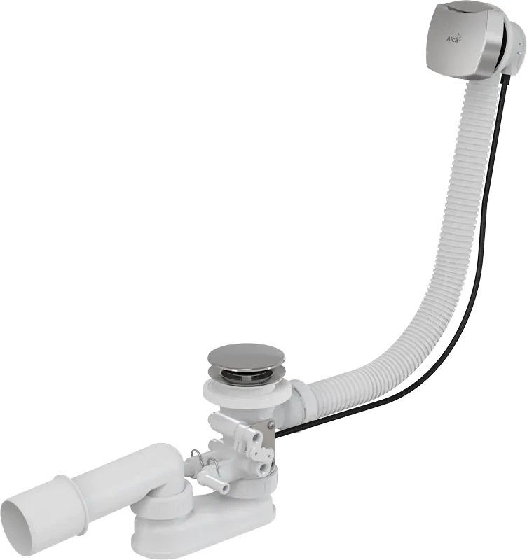 Alcadrain Sifón vaňový pre hydromasážne vane, chróm A566-112122-100; Vlastnosti: Súčasťou sifónu je mechanizmus, ktorý pri otvorení výpustu súčasne otvorí ventily, ktorými odteká zvyšková voda zo systémov masážne vane; Kompatibilné na väčšinu hydromasážou a aerosystémů; Pre napojenie slúžia dva odtoky - štandardné kolienko; Vodná zápachová uzávera s otočným kolenom; Uzatváranie odpadu pomocou bovdenového ovládanie; Flexibilné hadice prepadu; Použitie: Pre odtok vody z vane do odpadu; Pre hydromasážne vane; Pre vane s odtokovým otvorom 52 mm; Technické parametre: Zápachová uzávera 50 mm; Prietok 48,6 l / min; Prietok prepad 33,6 l / min; Odolnosť zápachové uzávery proti tlaku 588 Pa; Tepelný atest 95 st.C; Rozsah dodávky: Telo sifónu s prepadom a mechanizmom pre vypúšťanie HMS; Štandardné kolienko pre napojenie HMS 2 ks; Pochrómovaná plastová ovládacie hlavice; Pochrómovaná plastová zátka; Pochrómovaná nerezová mriežka výpuste; Zápachová uzávera z polypropylénu, tepelne a chemicky odolná, pozdĺžne zváraná; Montážny set; tvarové tesnenie(GT) Ean: 8595580541132