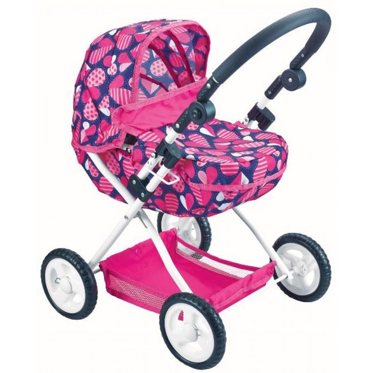 Poťah je ladený do ružovej farby so vzorom štylizovaných srdiečok. Rukoväť a kolieska sú čiernej farby, konštrukcia je biela. Kočík má tieniacu striešku, hlbokú vaničku a odkladaciu plošinku v spodnej časti. Dievčatká môžu bábiku položiť a vyraziť s ňou na prechádzku.