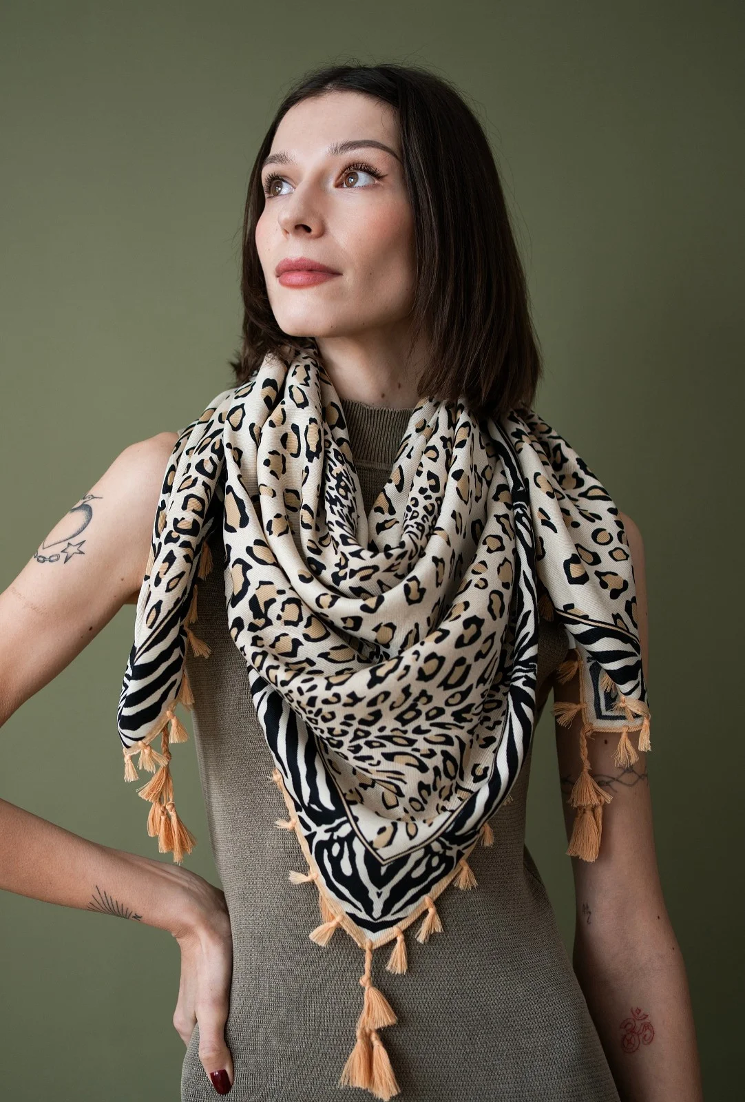 Farebná šatka s panterom - zakončený malými strapcami - dokonalý doplnok pre všetkých milovníkov zvieracích vzorov - ideálny na prechodné ročné obdobia a chladné letné večery - dá sa zložiť do trojuholníka a štylizovať ako ľahká pokrývka chrbta, šatka na krk alebo hlavu Zloženie: 100 % polyester