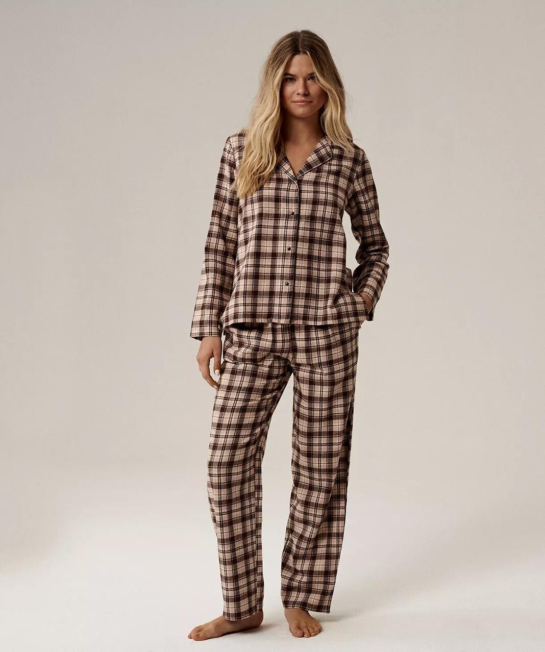 Klasické dámske pyžamo - mäkký bavlnený flanel - kockovaný vzor - blúzka s dlhými rukávmi - s golierom, zapínanie na gombíky - doplnená dlhými nohavicami - rovné, voľné nohavice - vrecká na bokoch - elastický pás podšitý bavlnou - balené v plastovom vrecku Zloženie: 100 % bavlna