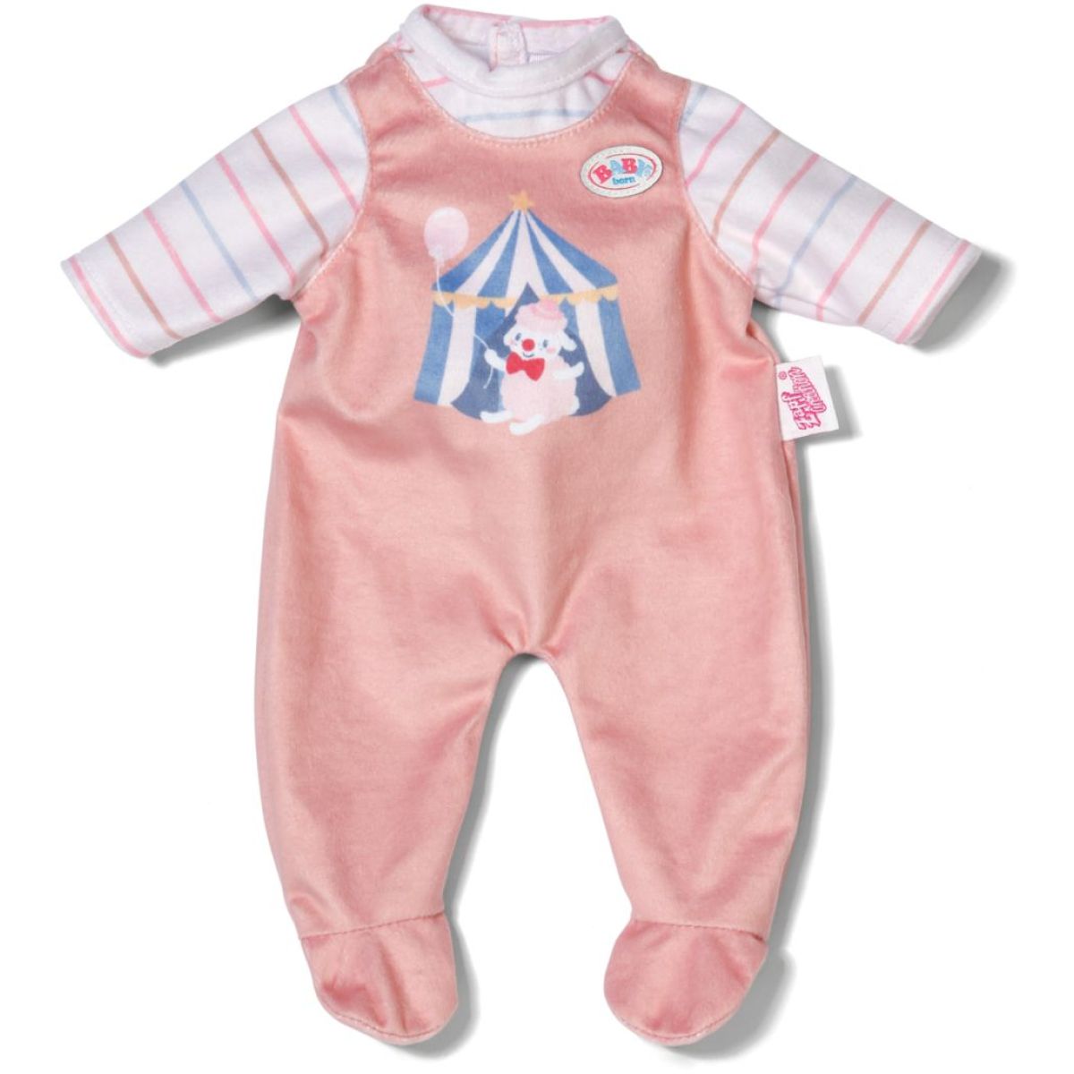 Tieto marhuľové dupačky s farebným cirkusovým motívom sú ideálne pre bábiky veľkosti 36 cm.
