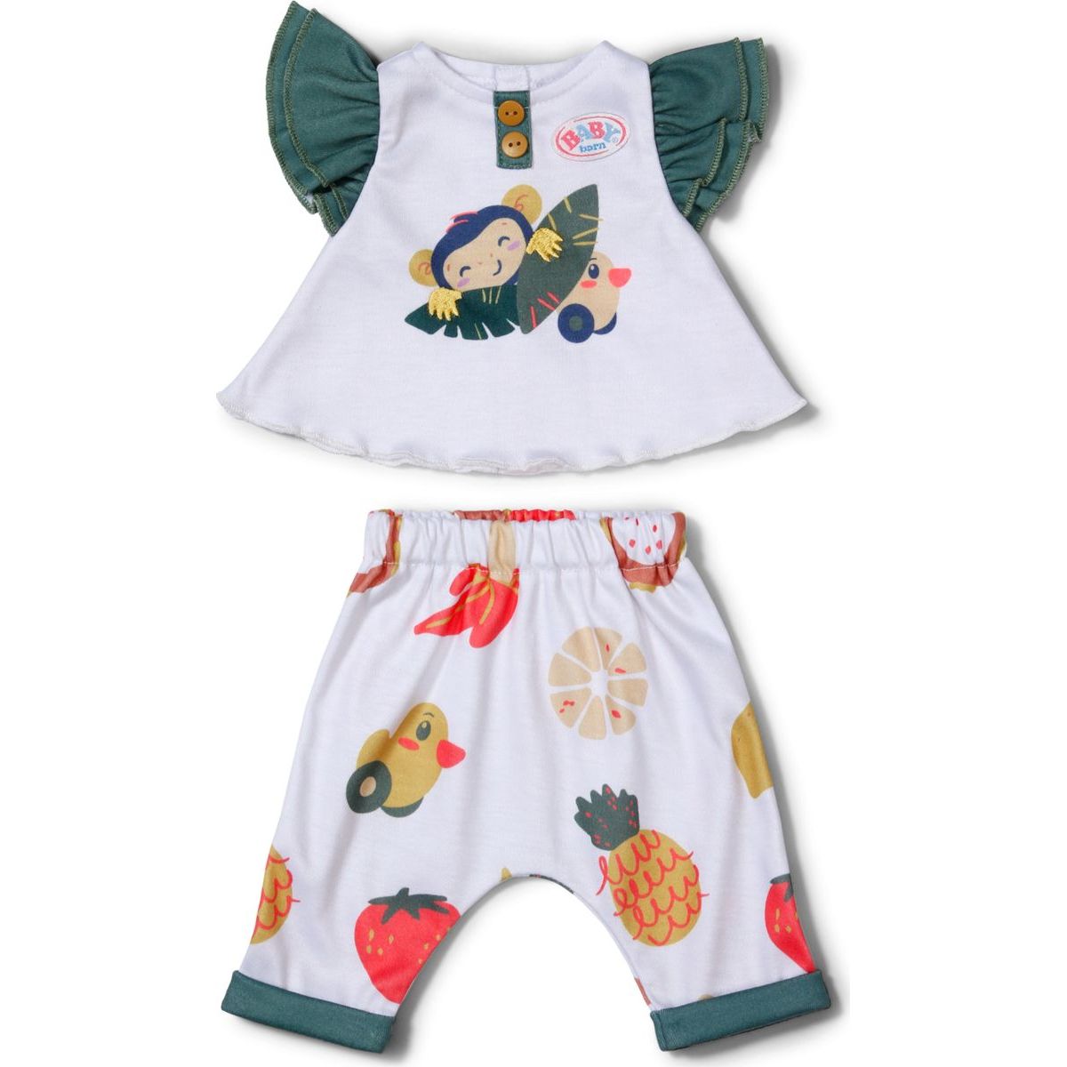 Súprava tričká a nohavíc. Tričko aj nohavice sú ozdobené roztomilou potlačou opičky, kačičky Berty a ovocia. Tričko s gombíkmi a volánikovými rukávmi.