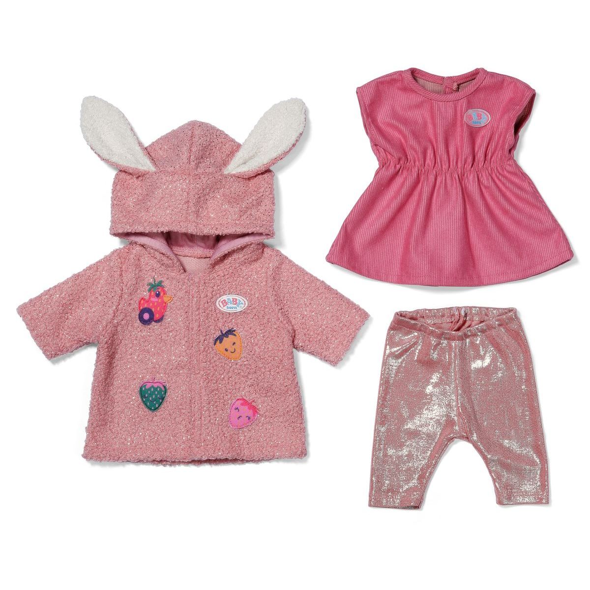 Premeňte svoju BABY born na najroztomilejšieho zajačika v okolí! Táto štýlová súprava prináša svieži vzhľad a maximálne pohodlie pre každé ročné obdobie. Hlavnou hviezdou setu je hebký plyšový kabátik s hravými uškami na kapucni, pod ktorým sa skrývajú elegantné šatôčky a pohodlné legíny v moderných farbách. Detaily v podobe jahôdok dodávajú outfitu ten správny šmrnc.