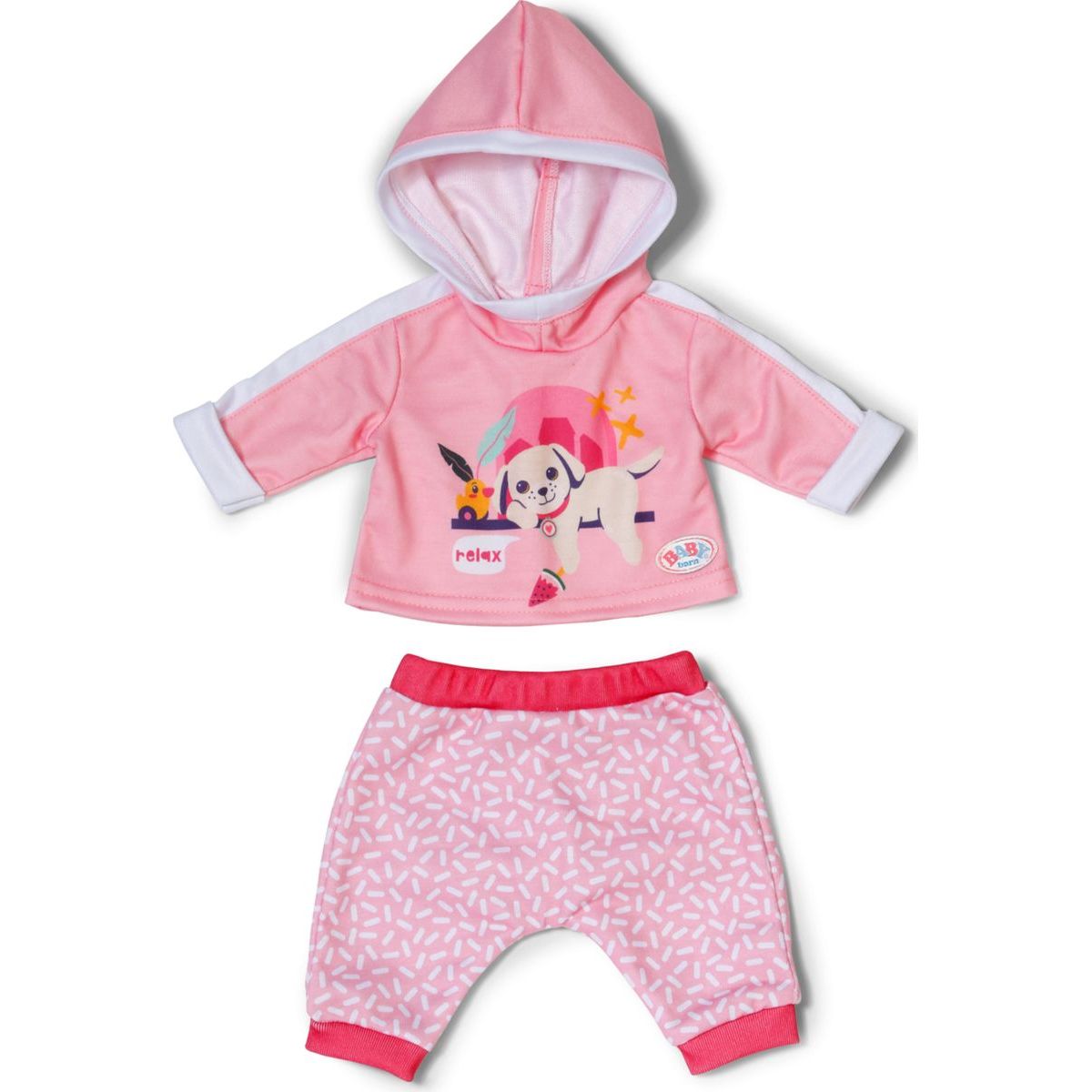 Odpočinok v ružovej teplákovej súprave s obrázkom odpočívajúceho psíka. Súprava ružovej mikiny a nohavíc.