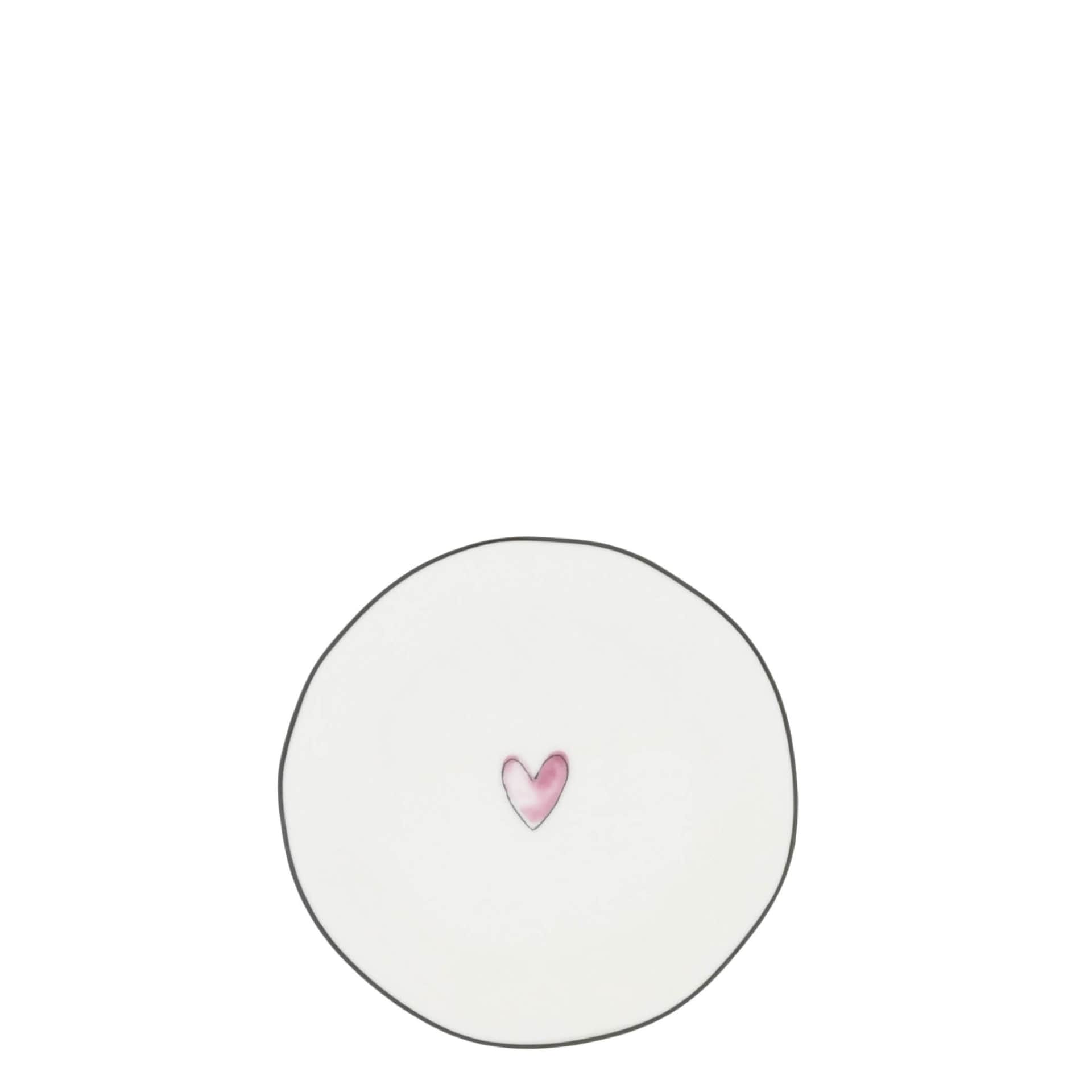 Bielu glazúru zdobí jednoduchý motív srdca v ružovom akvarele, ktorý je ručne maľovaný.