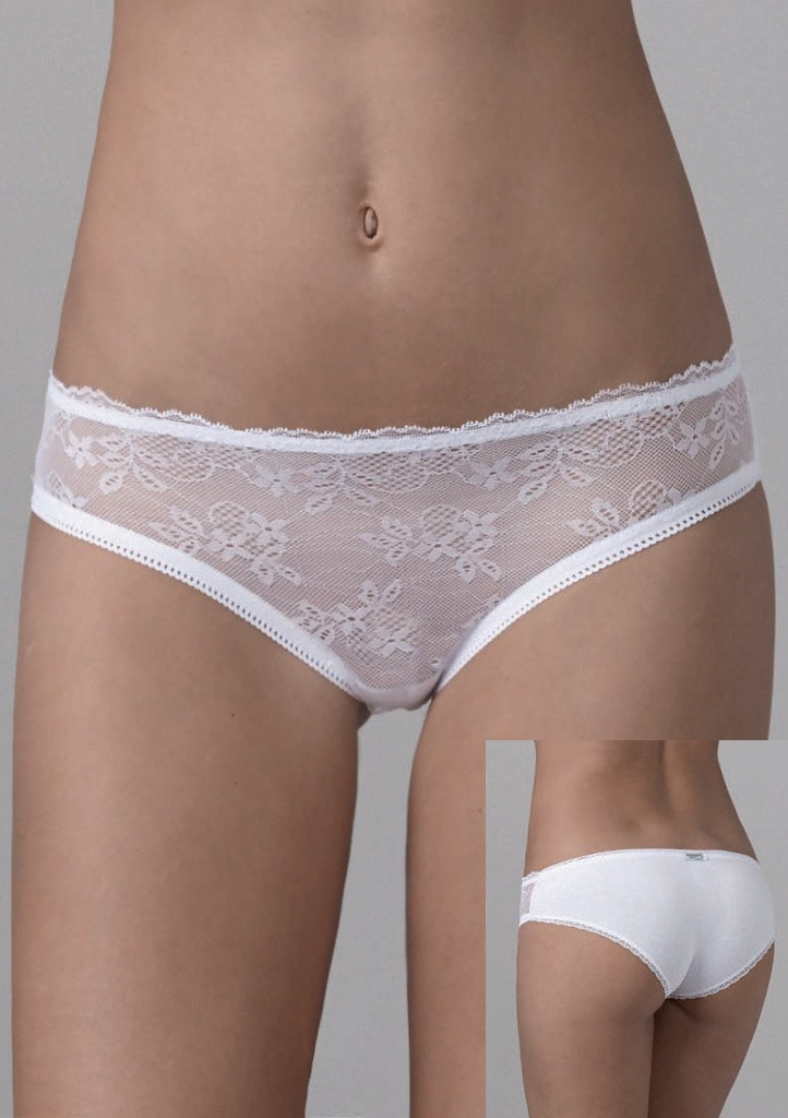 Dámske nohavičky značky Lovelygirl. Tieto nohavičky sú klasického nižšieho strihu kombinovanej v prednej časti priesvitnou kvetinovou čipkou, čo dodáva týmto nohavičkám jemnosť a romantický nádych. Zadná časť je vyrobená z hladkej látky a okraje nohavičiek sú olemované zdobenou elastickou krajkou. Nohavičky sú vyrobené z vysokého podielu bavlny a sú veľmi príjemné na celodenné nosenie. Vnútri nohavičiek je vsadený bavlnený klin.Materiálové zloženie: 90% bavlna, 10% elastan.