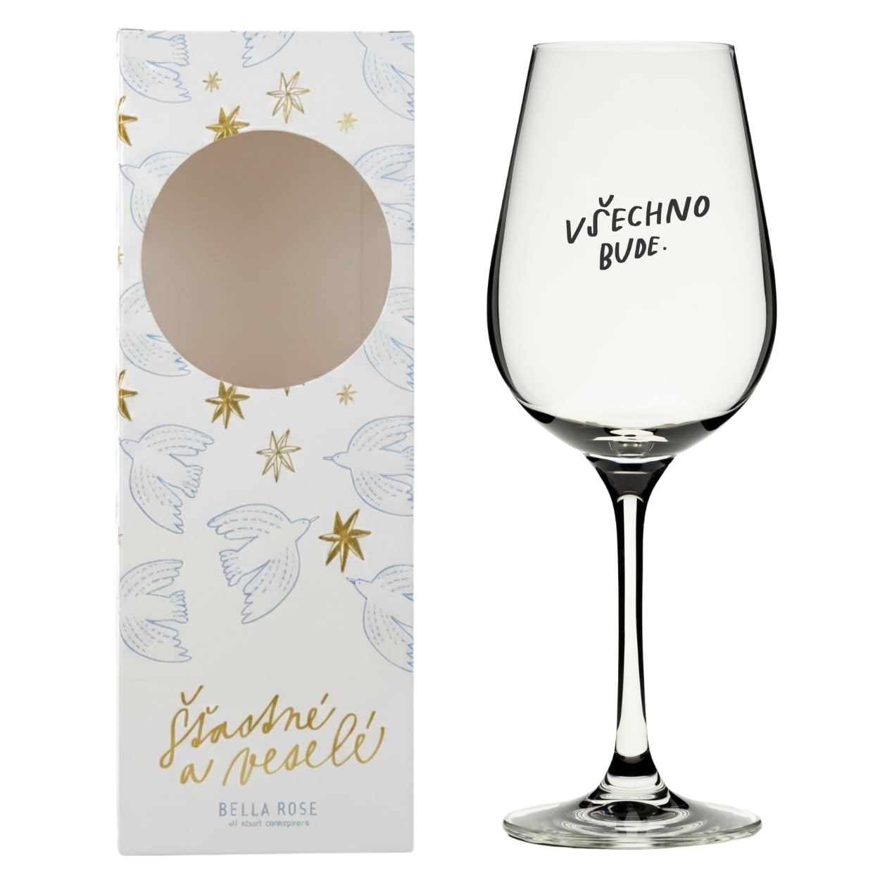 Všetko bude. Tichá pripomienka, že aj keď sa svet nevyvíja presne podľa plánu, stále existuje niečo, čo vás rozveselí. Napríklad pohár bieleho vína. Pohár na víno z kolekcie Bella Rose nesie ručne písaný nápis novým písmom od Zuzky Bartíkovej - výstižný detail, ktorý poháru dodáva nadhľad a nádych humoru.