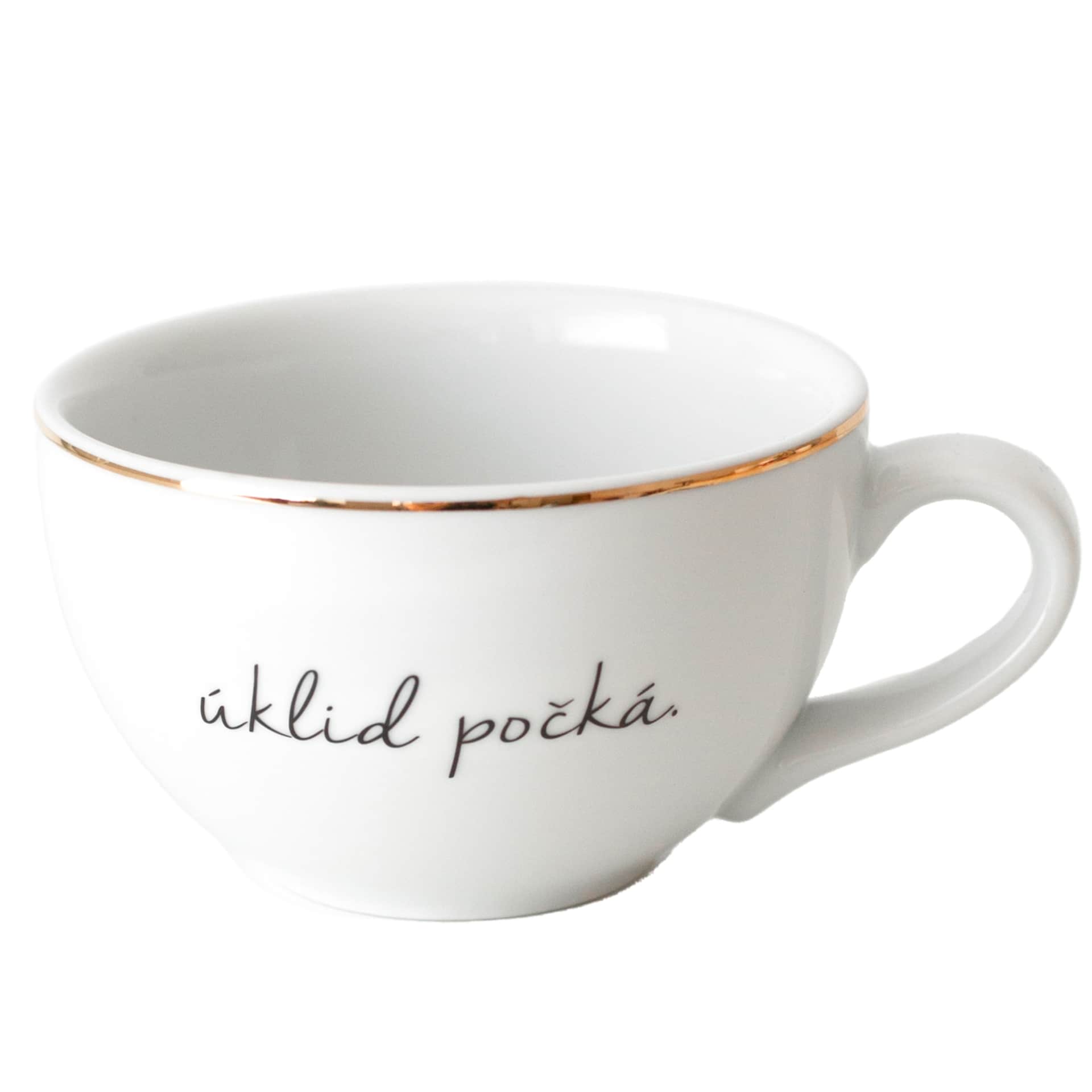 Porcelánový hrnček s nápisom Úklid počká bude ideálnym darčekom pre mamičku, manželku aj sestru, ktorým vykúzli úsmev na tvári a pripomenie, že občas je potrebné trochu spomaliť - veď je to čierne na bielom! Biely porcelán zdobí nielen čierny nápis, ale tiež zlatý prúžok, vďaka ktorému je zdobenie minimalistické, napriek tomu však elegantné a skvele dopĺňajúce akýkoľvek ďalší riad vo vašej zbierke.