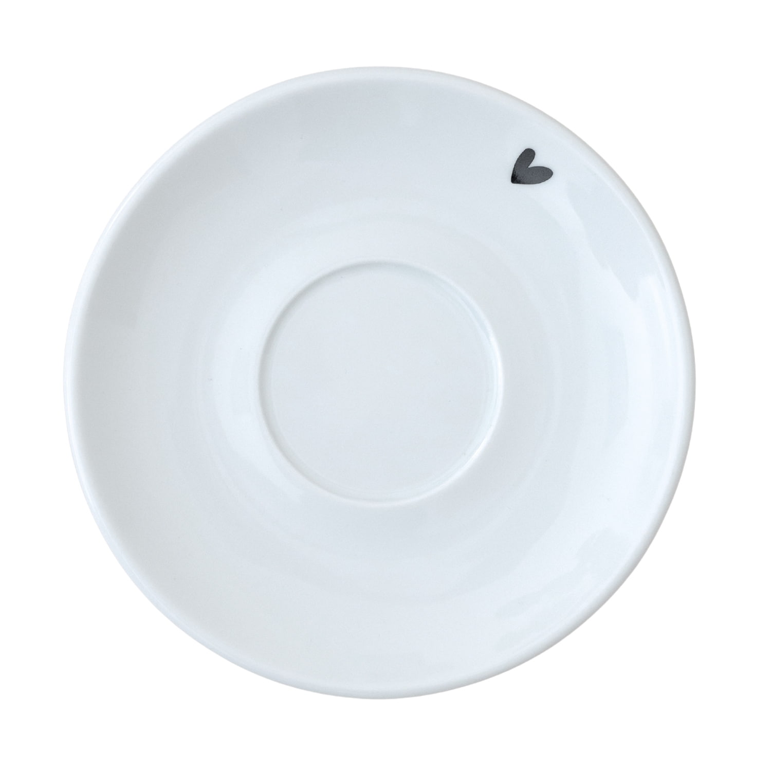 Biela porcelánová podšálka s minimalistickým čiernym srdiečkom od kaligrafky Zuzky Bartíkovej pôsobí čisto a jemne, a zároveň vnesie do každodenného stolovania osobitý detail.