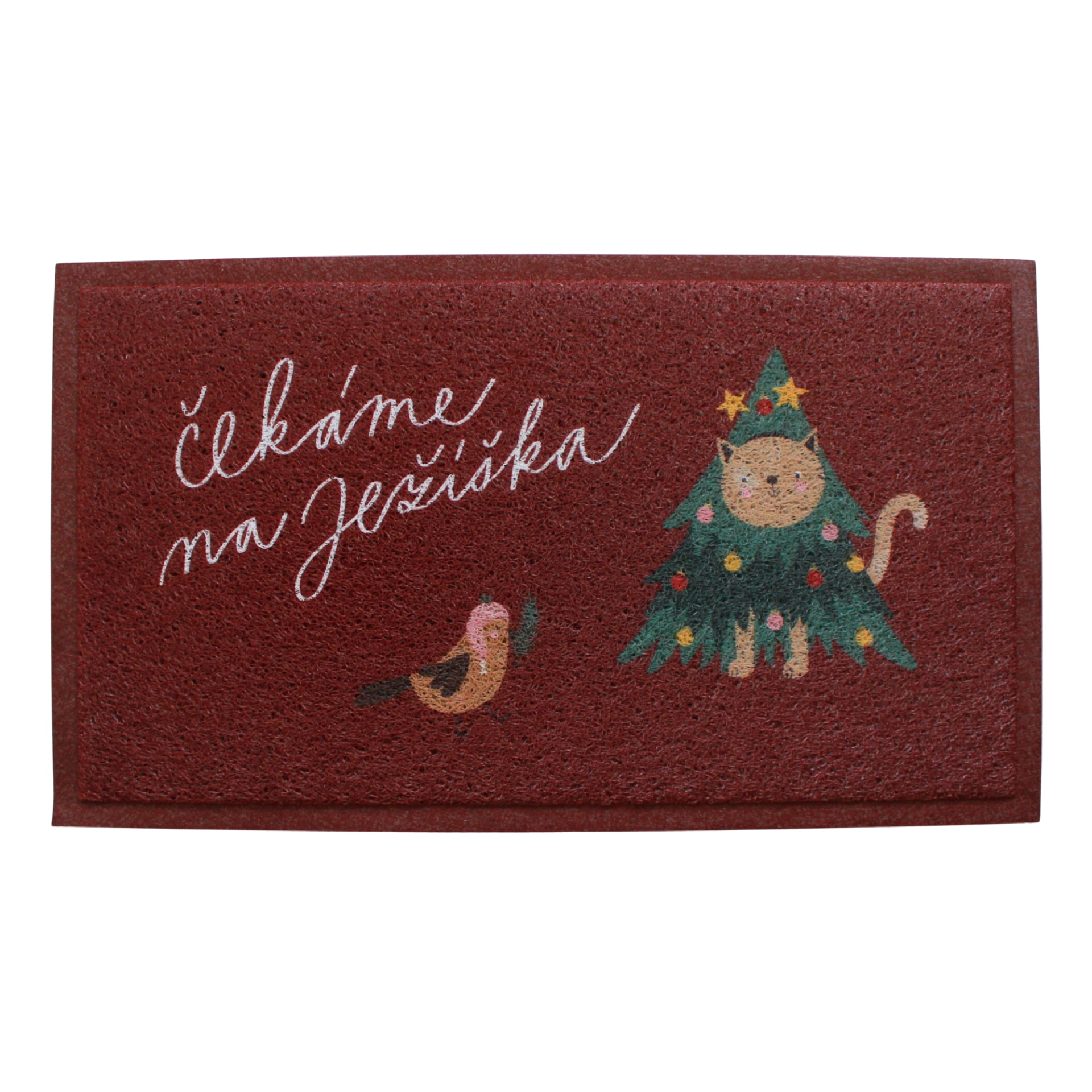 Rohožka z recyklovaného PVC má tlmený červený podklad a hravú ilustráciu mačky vo vianočnom stromčeku, ktorá číha na malého vtáčika v čiapočke. Dopĺňa ju nápis v českom znení Čekáme na Ježíška z pera modernej kaligrafky Zuzky Bartíkovej alias Flatwhite Lettering.