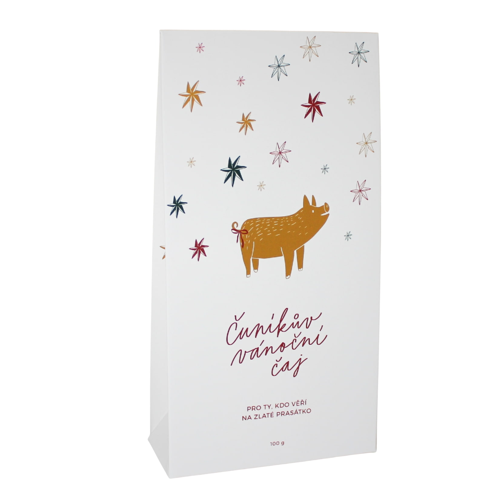 O ilustraci na krabičce se postarala nadaná Zuzka Bartíková, díky tomu je Čuníkův vánoční čaj skvělým adeptem na nejlahodnější dárek pod vánoční stromeček, kterým potěšíte všechny, kteří mají rok co rok políčeno na Zlaté prasátko.