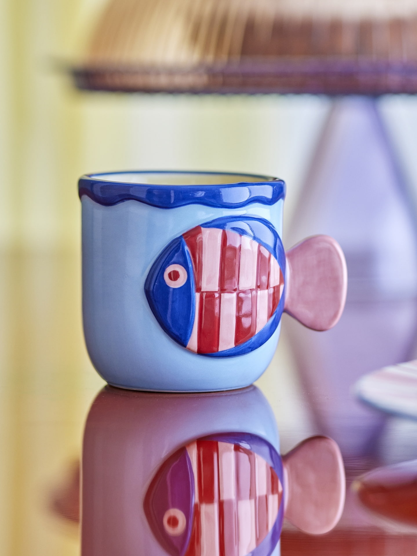 Reliéfny dekor s motívom ryby dodáva hrnčeku originálny vzhľad a ručne maľovaná glazúra v jemných viacfarebných tónoch podčiarkuje jeho jedinečný charakter.