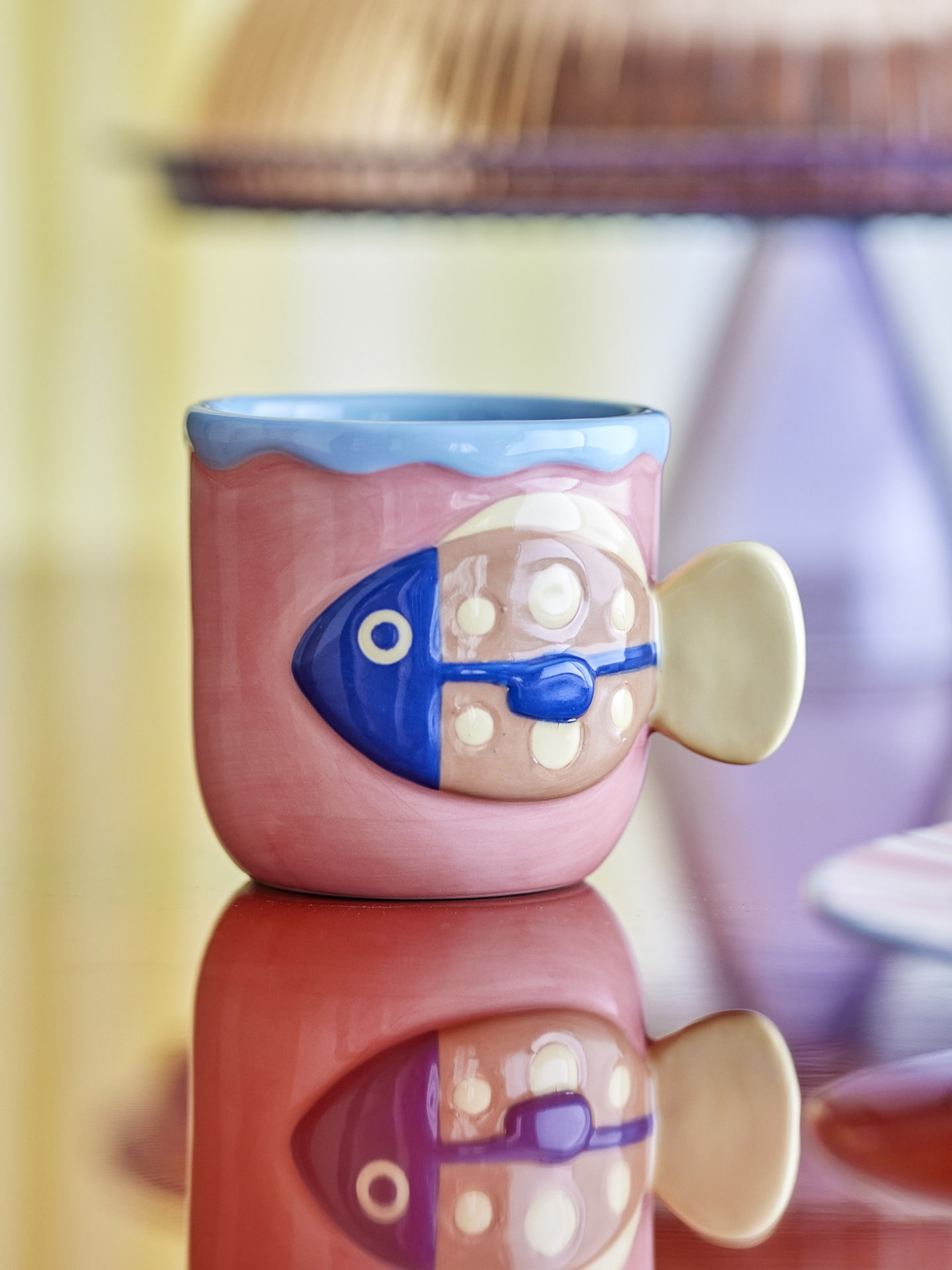 Reliéfny dekor s motívom ryby dodáva hrnčeku originálny vzhľad a ručne maľovaná glazúra v jemných viacfarebných tónoch podčiarkuje jeho jedinečný charakter.