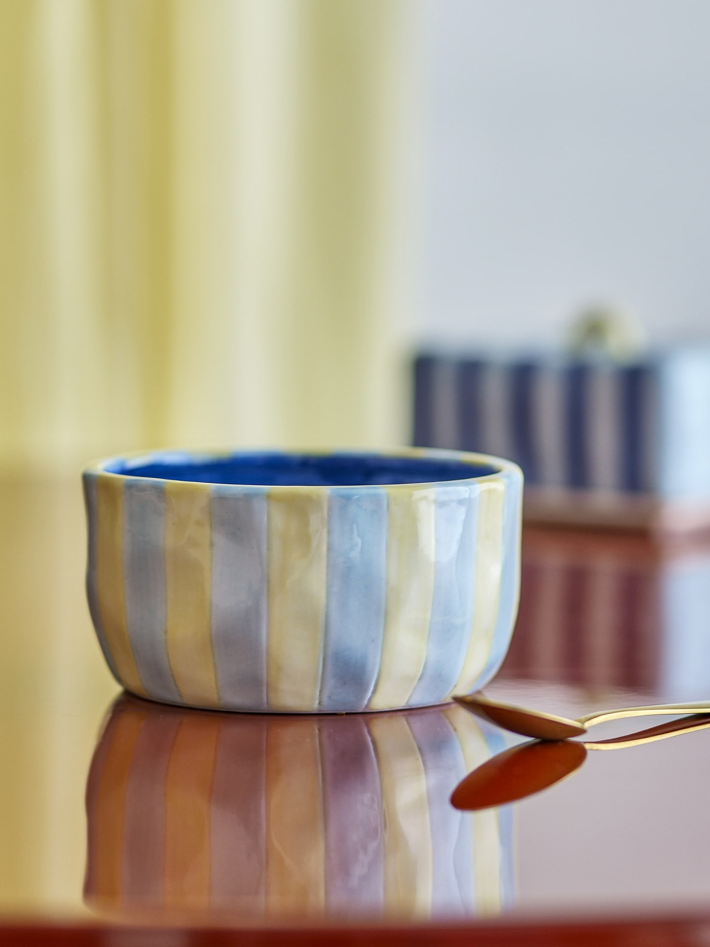 Miska má ručne maľované pruhy s kontrastným lesklým vnútrom. Mierne odchýlky vo farbe a vzore robia každý kus originálnym a jedinečným.
