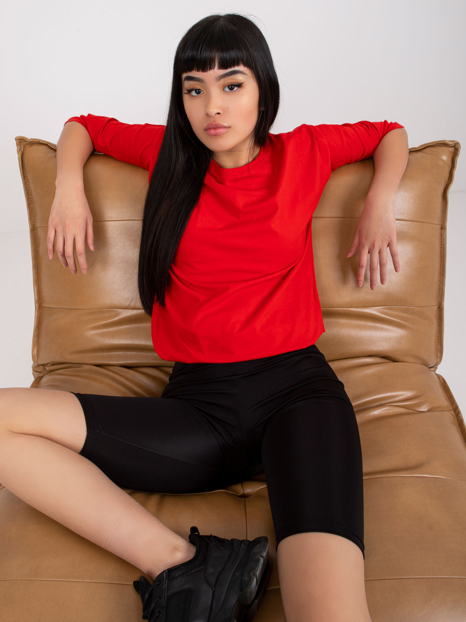 Czerwona bluzka Fiona. Gładka bluzka z bawełny jest wspaniałym uzupełnieniem każdej damskiej garderoby. Pozwala bowiem łatwo i szybko ubrać się na każdą sytuację, w której nie musimy prezentować się elegancko czy formalnie. Mimo to ta bluzka basic ma w sobie mnóstwo wdzięku i kobiecego uroku, a to za sprawą szerokiego dekoltu w kształcie łódki. Model ten wykonano z delikatnej i niezbyt grubej bawełny z niewielkim dodatkiem nowoczesnego elastanu. Takie połączenie sprawia, że bluzka jest jednocześnie miękka i przyjemna w dotyku, a także przewiewna, przyjazna dla skóry i ładnie układa się na sylwetce. Dodatkowymi atutami tego modelu są również modne rękawy długości 3/4 oraz ozdobny troczek ze ściągaczem u dołu, które subtelnie podkręcają jej design. Prosty, lekko luźniejszy krój pozwala czuć się swobodnie, a bogactwo kolorów dostępnych w naszym sklepie internetowym z pewnością spodoba się wielu miłośniczkom najnowszych trendów. Ponadto zwróć jeszcze uwagęCzerwona bluzka bawełniana to obok modelu w kolorze białym i czarnym prawdziwy must have każdej damskiej szafy. Pozwala budować klasyczne stylizacje i jest świetnym elementem tak zwanej garderoby kapsułowej, która promuje ubieranie się na co dzień w kilka podstawowych rodzajów ubrań i miksowanie ich ze sobą. W ten sposób zaoszczędzisz mnóstwo czasu, który inaczej przeznaczyłabyś zapewne na wymyślanie każdego ranka skomplikowanych zestawów ubrań, które finalnie niekoniecznie spełniłyby Twoje oczekiwania. Tymczasem czerwona bluzka basic z serii Fiona gwarantuje zawsze udany look i pełną satysfakcję z osiągniętego efektu! Nigdy Cię nie zawiedzie i jest zawsze trafionym wyborem, ponieważ idealnie dopasuje się do spodni jeansowych o modnych fasonach i szpilek albo do ołówkowej spódnicy dresowej i modnych butów sportowych. Interesują Cię mniej intensywne kolory? Żaden problem, bluzka basic Fiona dostępna jest w naszym sklepie online w kilkunastu stylowych odcieniach do wyborzloženie tkaniny: 90 % bavlna, 10 % elastanspôsob prania: pranie v práčke pri 30 °CModelka má na sebe veľkosť XS. Rozmery modelky: výška 167 cm, prsia 73 cm, pás 64 cm, boky 91 cm.Rozmery blúzky veľkosti XS merané na plocho: šírka v podpazuší - 54 cm, celková dĺžka - 60 cm, dĺžka rukáva - 41 cm.Veľkosť alt.VýškaObvod hrudníkaVonkajšia dĺžka rukávaVonkajšia dĺžka rukávaXS34156-164785747S36160-164825949M38162-172866151L40164-174916353XL42166-178966555