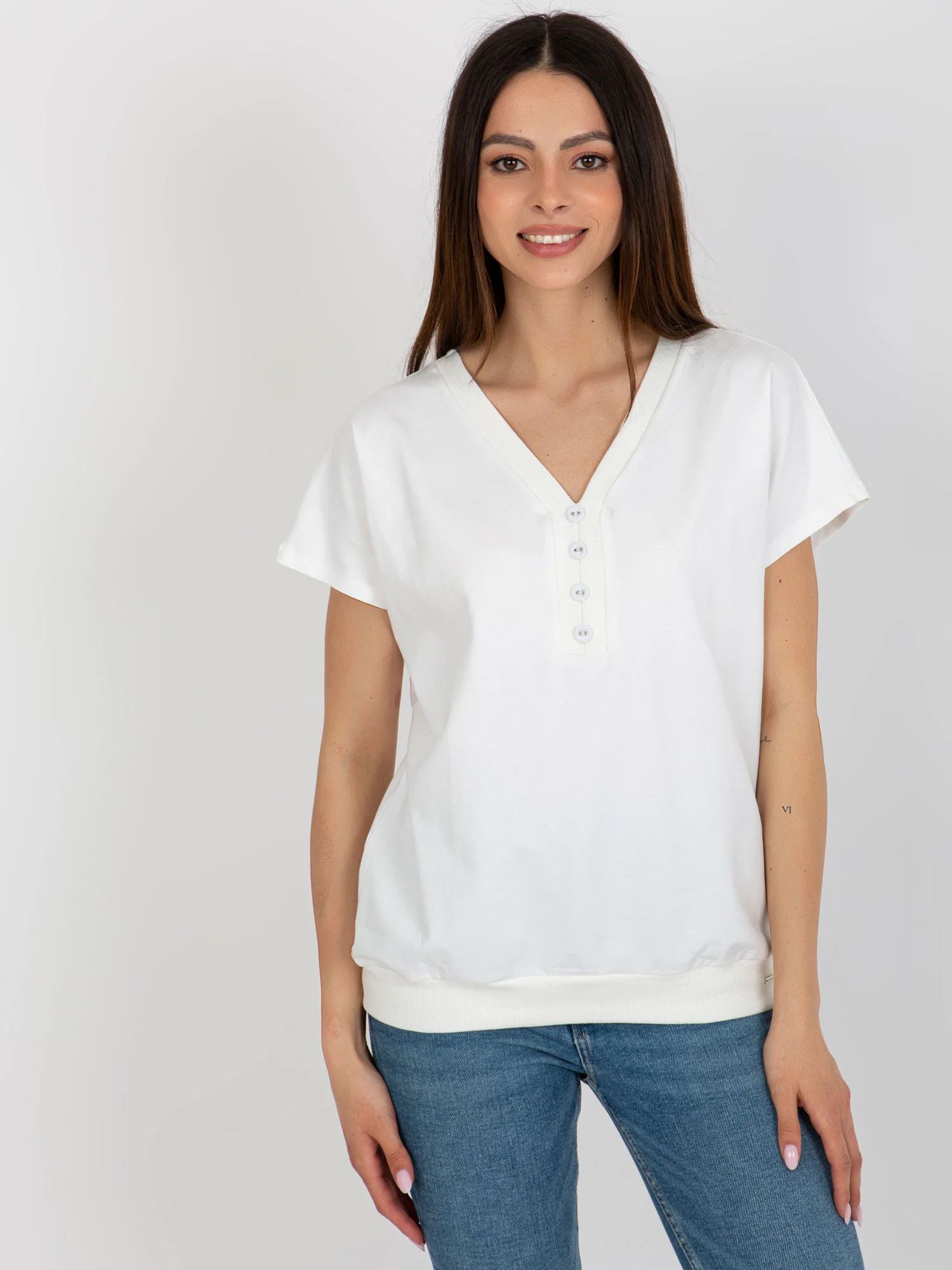 Základná bavlnená blúzka vo farbe ecru s výstrihom do V. Kód výrobku: RV-BZ-8827.95 dominantný vzor: hladký štýl: ležérny príležitosť: ležérna, letná, mestská, na vychádzky Modelka má na sebe veľkosť S/M. Rozmery modelky: výška 175 cm, prsia 84 cm, pás 61 cm, boky 91 cm. Rozmery blúzky vo veľkosti S/M merané na plocho: šírka v podpazuší - 56 cm, celková dĺžka - 64 cm.Veľkosť Alt.VýškaObvod hrudníkaVonkajší. dĺžka. rukávVnútorný. dĺžka rukávovS/M36/38160-17282-8659-6149-51L/XL40/42164-17891-9663-6553-55