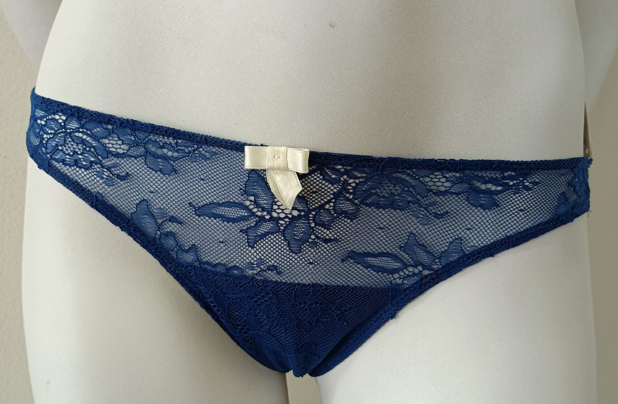 Dámske luxusné čipkované brazílske nohavičky Selmark. Jednofarebné na prednej strane, s bielymi kvetmi našitými na zadnej strane. 52% polyamid, 18% polyester, 15% bavlna, 8% polyuretán, 7% elastan