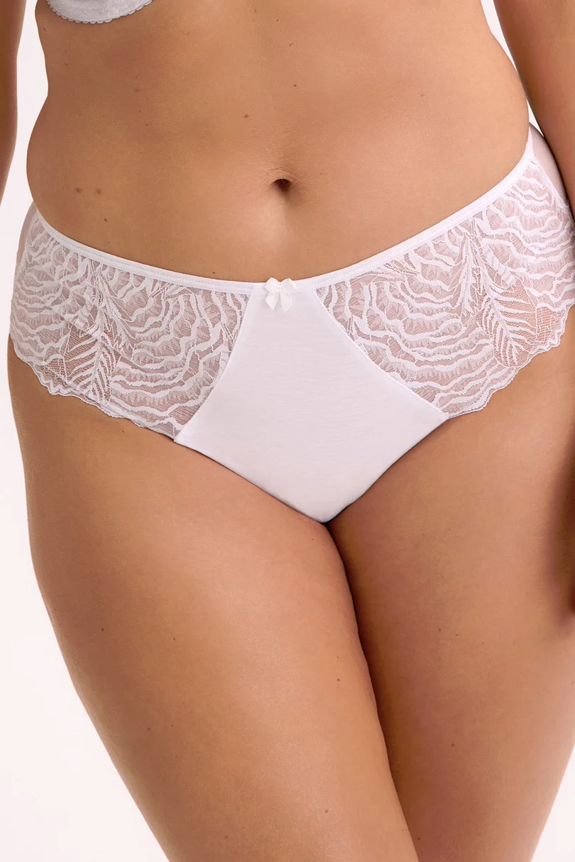 Biele brazílske nohavičky Jessia sú elegantnou kombináciou moderného štýlu a jemnej ženskosti. Sú vyrobené z elastickej čipky a jemného tylu, zmyselne zvýrazňujú siluetu a zároveň ponúkajú výnimočné pohodlie. Čipka na prednej strane, zadnej strane a nohavičkách dodáva jedinečný, romantický nádych, zatiaľ čo priehľadný tyl na bokoch zadnej časti dodáva ľahkosť a zoštíhľujúci efekt. Predná časť z mikrovlákna a bavlnený klin zaručujú pohodlie a šetrnosť k citlivej pokožke, vďaka čomu sú nohavičky Jessia ideálnou voľbou na každodenné nosenie aj na výnimočné príležitosti. Zloženie: 75 % polyamid, 15 % elastan, 10 % bavlna