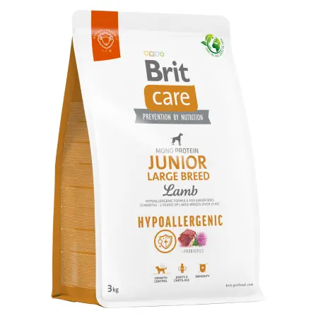 Brit Care Dog Hypoallergenic Junior Large Breed Hypoalergénne kompletné krmivo pre mladých psov veľkých plemien (3 mesiace - 2 roky), monoproteínová receptúra, obohatená ryžou, pestrecom mariánskym a lososovým olejom, optimálny pomer bielkovín a tukov, s probiotikami. Pre podporu imunitného systému je krmivo doplnené vývoj kĺbov a chrupaviek aj o chondroprotektíva. Určené pre mladé psy (3 mesiace – 2 roky) Vyvinuté pre potreby veľkých plemien (nad 25 kg) S príchuťou jahňacieho mäsa a ryže Hypoalergénna a monoproteínová receptúra Vhodné pre psy s citlivým trávením Obsahuje chondroptotektíva, probiotiká a pestrec