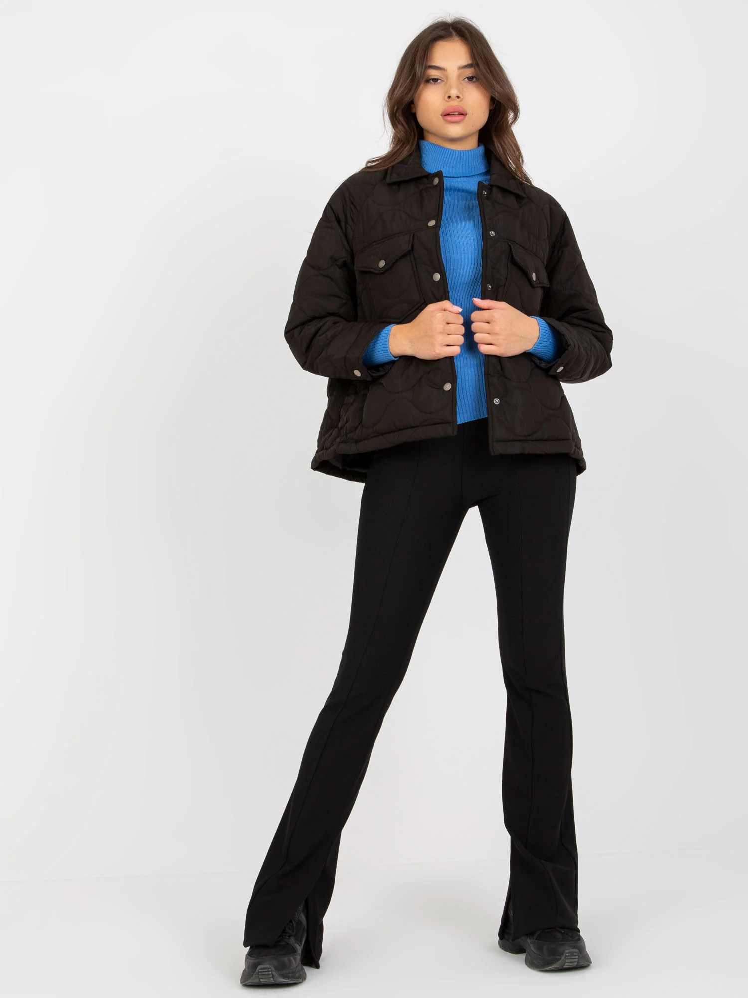 Čierna prechodná prešívaná bunda bez kapucne. Kód výrobku: AI-KR-8499K.91 dominantný vzor: jednofarebný štýl: ležérny príležitosť: príležitostné, do mesta, na prechádzky, do práce Modelka má na sebe veľkosť S. Rozmery modelky: výška 172 cm, prsia 88 cm, pás 61 cm, boky 92 cm. Rozmery bundy vo veľkosti S merané na plocho: šírka v podpazuší - 54 cm, dĺžka rukáva - 58 cm, celková dĺžka - 65 cm.Veľkosť Alt.VýškaObvod hrudníkaVonkajší. dĺžka. rukávVnútorný. dĺžka rukávovS36160-164825949M38162-172866151L40164-174916353