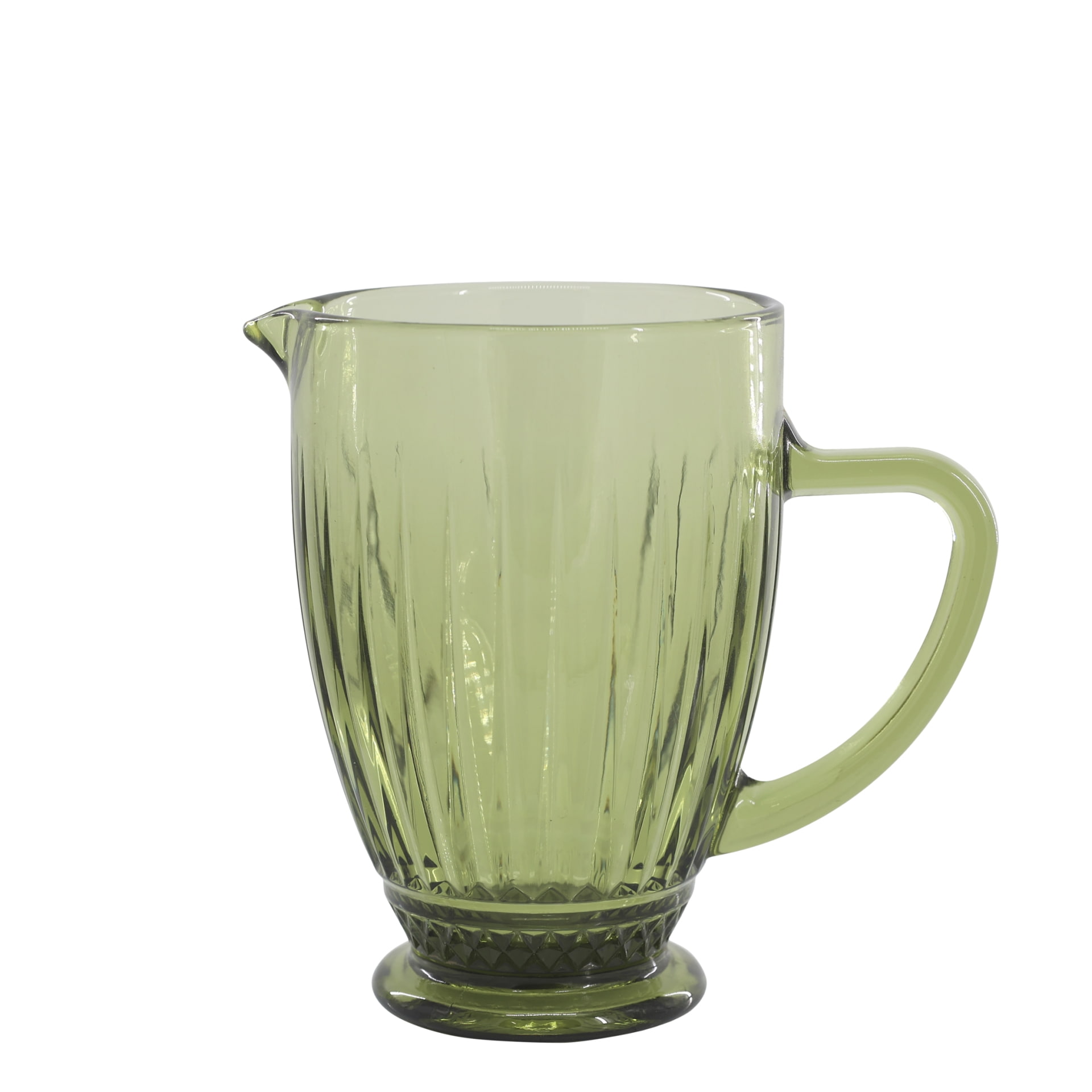 Je vyrobený z priehľadného skla v zelenej farbe, má praktické veľké ucho a jeho povrch zdobí plastický vrúbkovaný dekor.