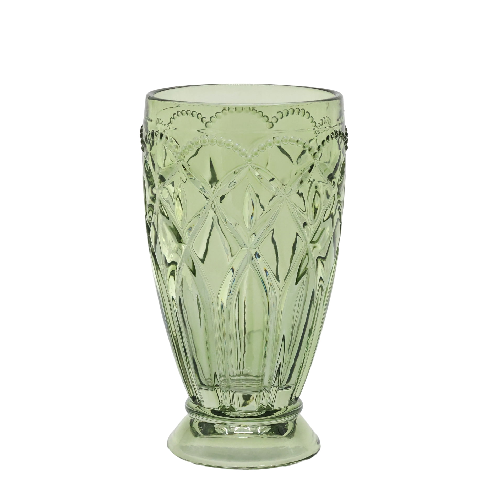 Pohár je zo skla v jemnom zelenkavom odtieni a jeho povrch zdobí plastický dekor, ktorý dodáva poháru osobitý vzhľad. Pôsobí tak krehko a nežne. Bude tak ideálny do kuchyne v romantickom štýle.