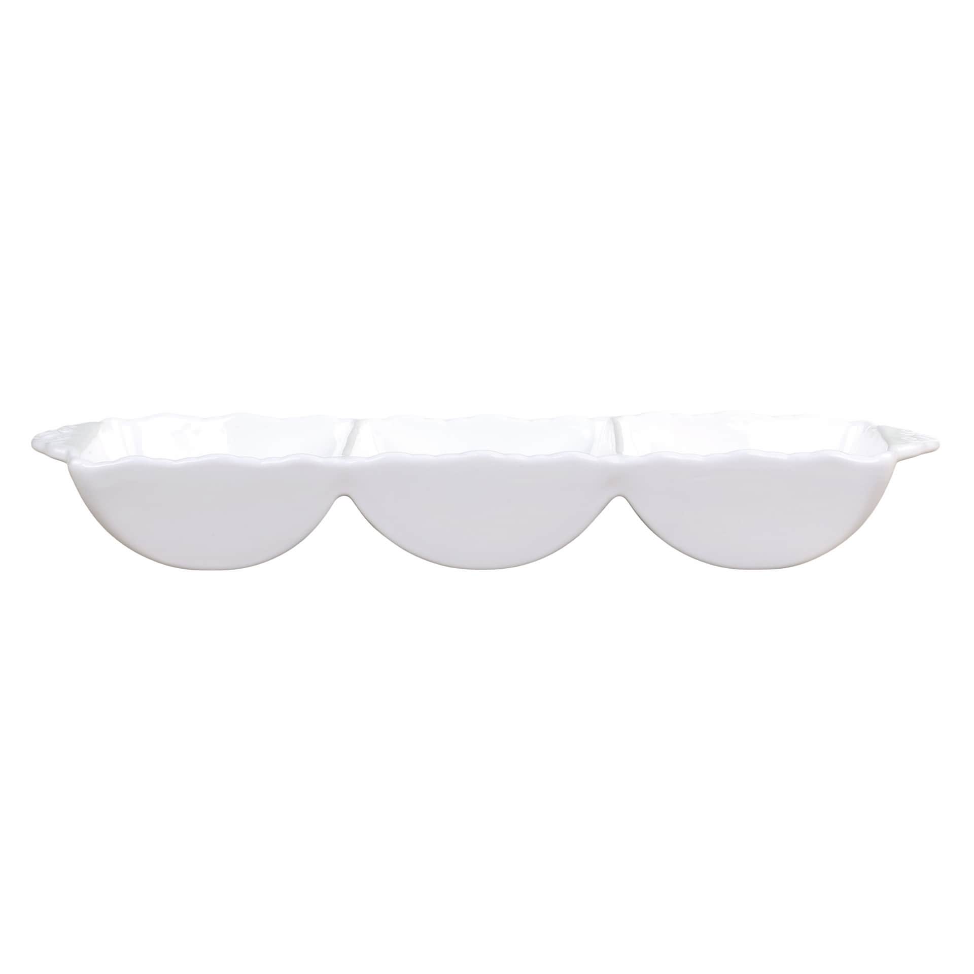 Originální trojmiska je rozdělena na tři mističky a tak do ní pohodlně naservírujete různé druhy oříšků, plněných poliv nebo dipy, ale i zmrzlinu nebo ovocný pohár. šírka 33 cm / hĺbka 10 cm Vyrobené z porcelánu.