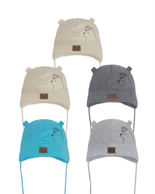 Chlapčenská čiapka s ušami- zviazané na krku- zdobené jemnou tlačou- náhodne vybrané dostupné farby: béžová, tyrkysová, svetlosivá, tmavosivá Zloženie: 95% bavlna, 5% elastan