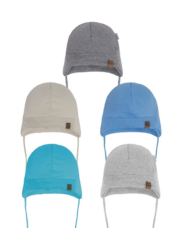Chlapčenská čiapka- zviazané na krku- zdobené jemnou aplikáciou- náhodne vybrané dostupné farby: béžová, tyrkysová, svetlosivá, tmavosivá Zloženie: 95% bavlna, 5% elastan