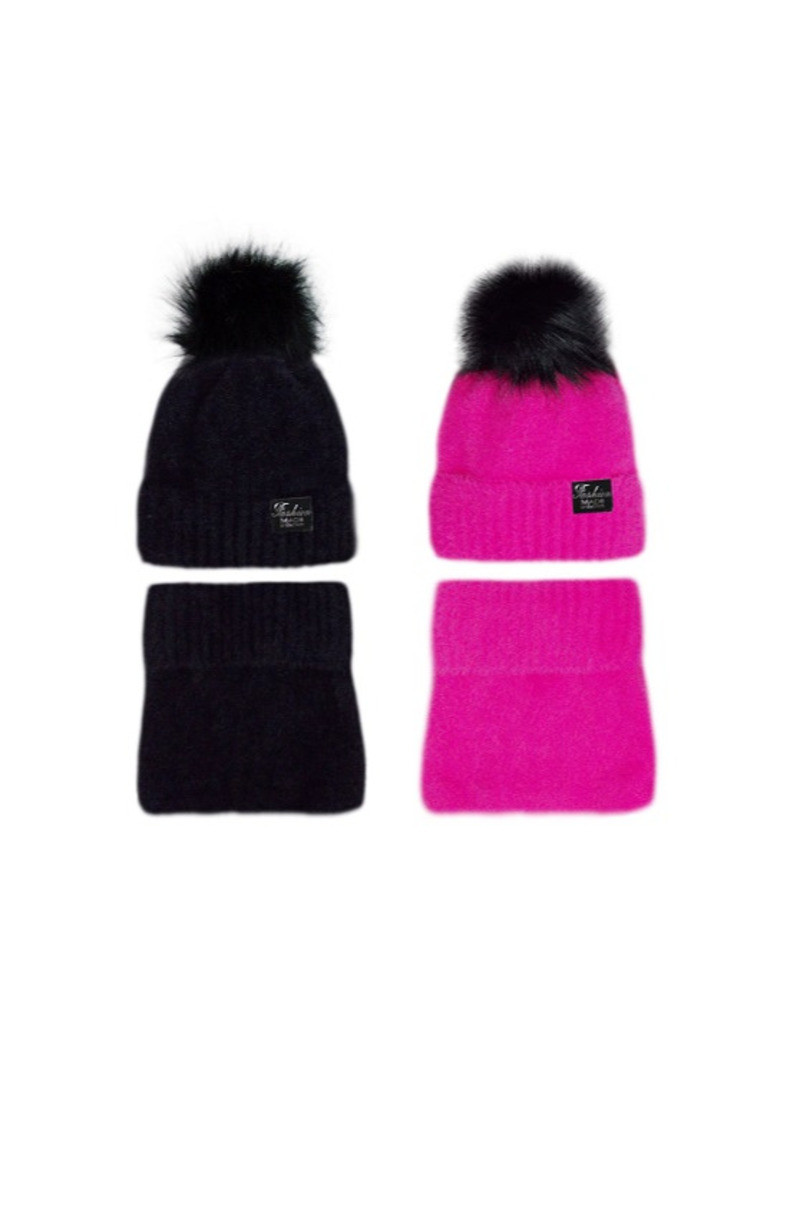 Dámska súprava: čiapka z huňatého polyamidu s bavlnenou podšívkou, stiahnutá dozadu s huňatou bambulou a komínom. .