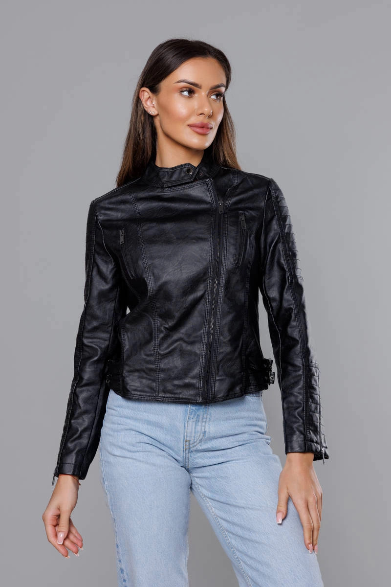 Venujte prosím pozornosť pri výbere veľkosti podľa veľkostnej tabuľky uvedenej nižšie. Veľkosti nezodpovedajú bežne nosené konfekciu. Bunda ramoneska z ekologickej kože Bunda má jednoduchý strih, stojačik, dve vrecká a zapína sa asymetrickým zipsom. Model je ozdobený ozdobným prešívaním. V spodnej časti modelu sú na bokoch pásky s prackami. Bunda má dĺžku k bokom. Zloženie: vrchná vrstva - 100% PU; podšívka - 100% polyester.