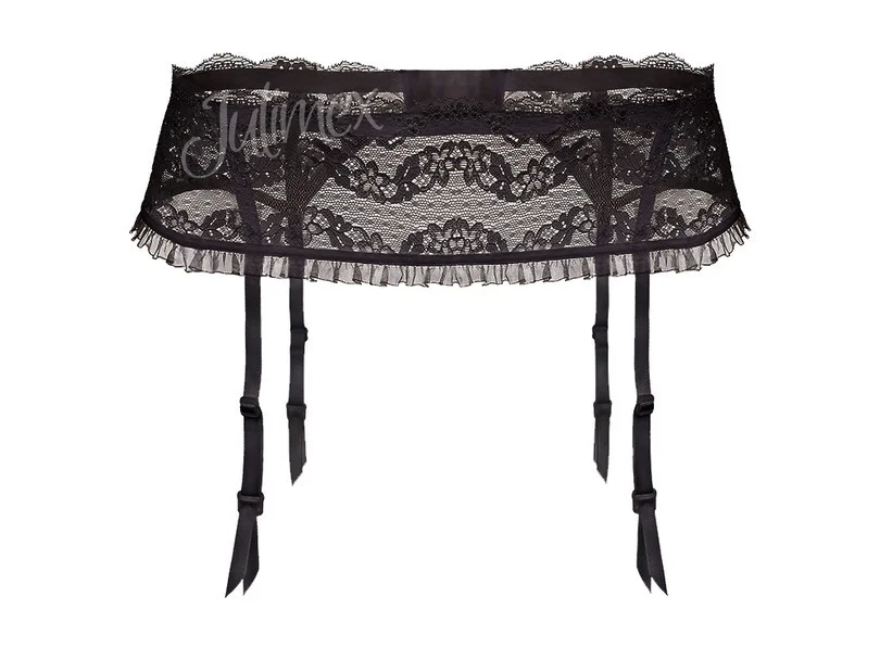 Široký dámsky krajkový podväzkový pás s kvetovanými retiazkami na jemnej sieťovine. Spodný okraj modelu je olemovaný majstrovským volánikom. Ramienka na pančuchách a zapínanie sa dajú nastaviť. Model je elegantný a pôsobí veľmi žensky. Zloženie: 88% polyamid, 12% elastan.