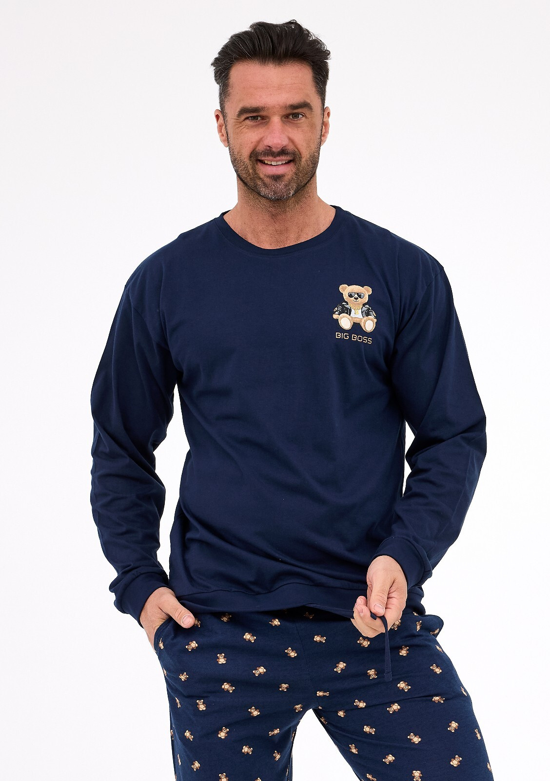 Pánske pyžamo - vysokokvalitná bavlna - tričko s dlhým rukávom - okrúhly výstrih - malá potlač medvedíka na hrudi - dlhé nohavice - elastický pás so šnúrkou na stiahnutie na úpravu obvodu pása - bočné vrecká - manžety, spodný okraj a nohavice s rebrovanými lemami Zloženie: 100 % bavlna