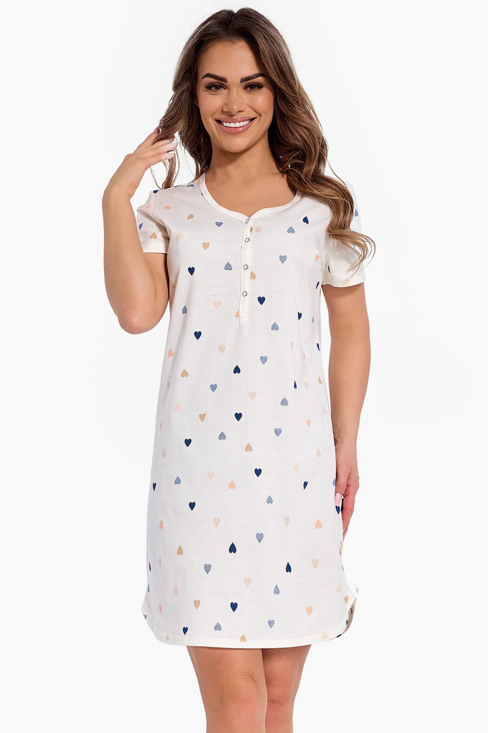 Nočná košeľa značky Cornette. model KR 617/309 Heart 3. výrobok je vyrobený zo 100% bavlny. dĺžka: krátka. miesto zapínania: vpredu. dĺžka rukávov: krátke. výstrih: okrúhly. nočná košeľa sa zapína na patentky. dámsky výrobok.