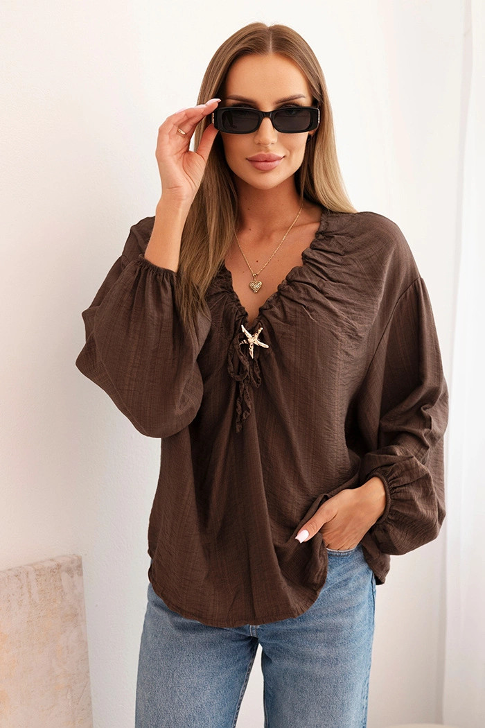 Táto dámska blúzka z viskózy je kombináciou pohodlia a ženského štýlu. Je vyrobená z ľahkého, priedušného materiálu a je ideálna na každodenné nosenie, ako aj na spoločenské udalosti. Hlboký výstrih s nastaviteľným výstrihom a ozdobnou šnúrkou v tvare hviezdy priťahuje pozornosť a dodáva originálny charakter.Voľnejší strih zaručuje voľnosť pohybu a dlhšie rukávy zakončené elastickou gumičkou dodávajú pohodlie pri nosení a jemnú eleganciu. Je to model, ktorý vyzerá krásne v každej štylizácii.Veľkosť je univerzálna a padne dámam vo veľkosti M, L alebo XL.Vyrobené v TalianskuVlastnosti výrobku: Vhodný na nosenie v šatníku, ktorý je súčasťou balenia: Ľahký, priedušný materiál Posádkový výstrih a ozdobné viazanie Rukávy ukončené elastickou páskou Pohodlný, voľný strih Štýlový detail prívesku nižšie uvedené rozmery sú merané na plocho +/- 1 cmPre získanie obvodu vynásobte šírku 2 Rozmery: Šírka v podpazuší: 66 cm Celková dĺžka: 61 cm Dĺžka rukávu od ramena: 42 cm Dĺžka rukávu od ramena: 55 cm Zloženie materiálu: materiál: 100% viskóza