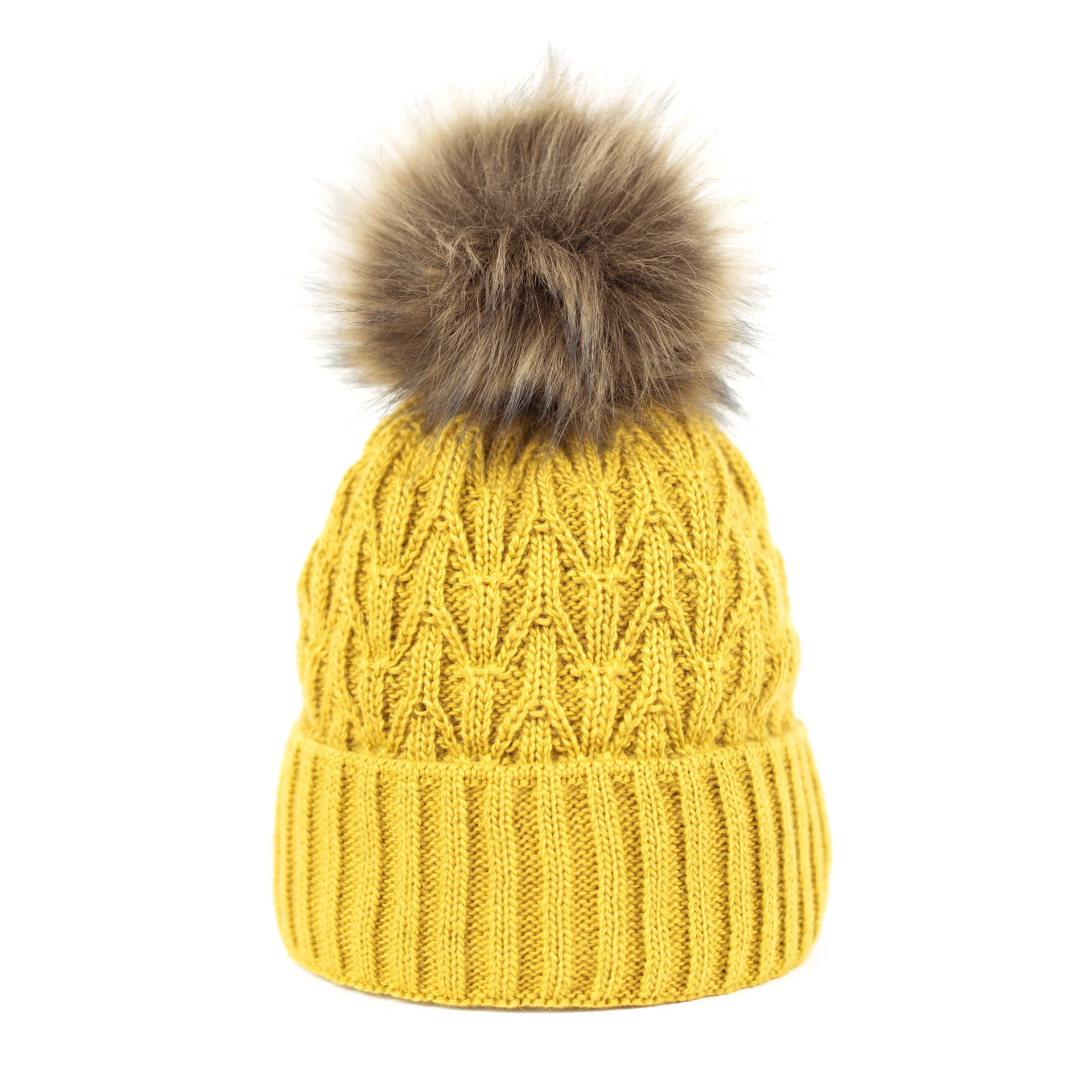 Zimná čiapka s bambulou. Vyrobená z dvojitého materiálu. Vyrobená z umelej kožušiny. Ľahká elastická. Prispôsobená vlasom v spone. Vhodná na každodenný styling. 85% akryl 15% polyamid Farba: žltá Kolekcia: jeseň/zima Pohlavie: ženské